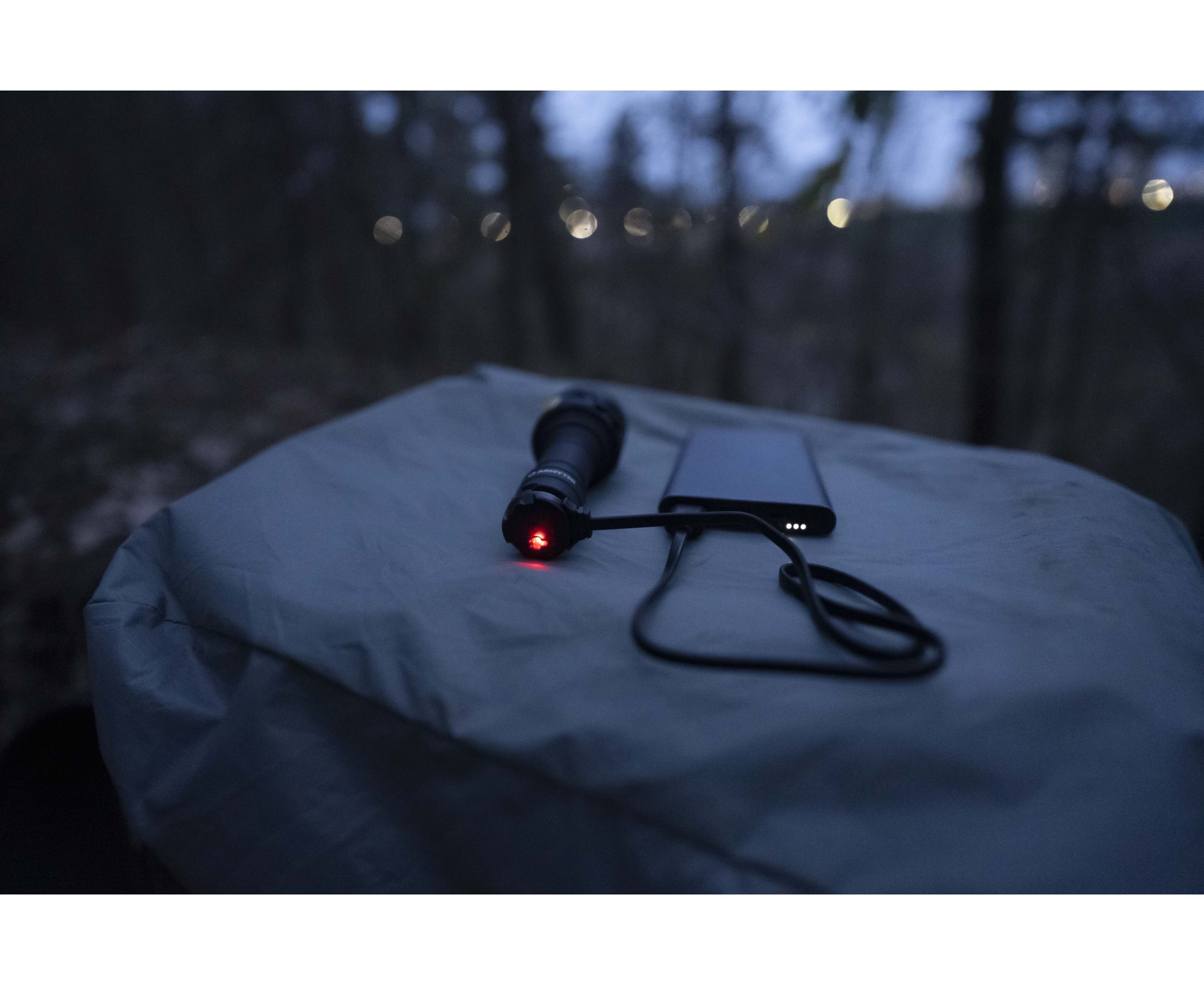 Фонарь работает на комплектном аккумуляторе 21700 Li-Ion или на стандартном элементе питания 18650 Li-Ion с использованием адаптера.