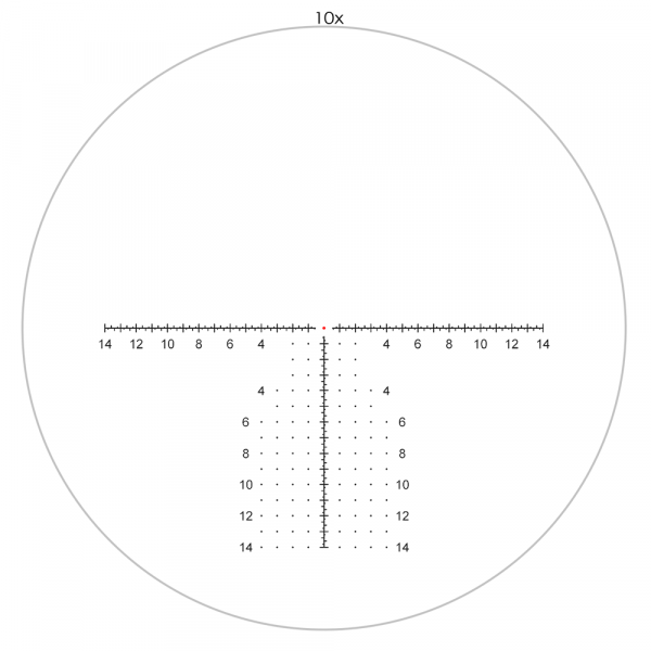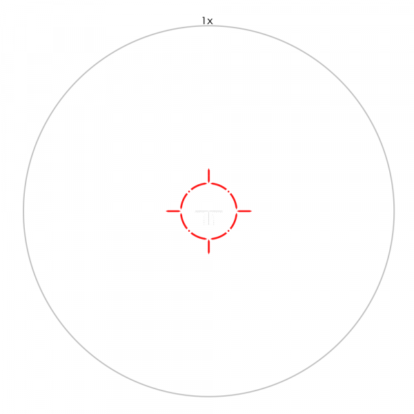- Прицельная сетка AM1102. Сетка AM1102 расположена в первой фокальной плоскости и представляет собой прерывистый круг с засечками под углом 90°, внутри которого расположена T — образная разметка для ввода поправок и прицельная марка. Окружность дает возможность быстро захватить цель и выстрелить навскидку при стандартном оптическом увеличении.