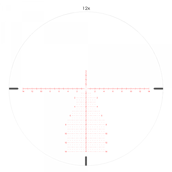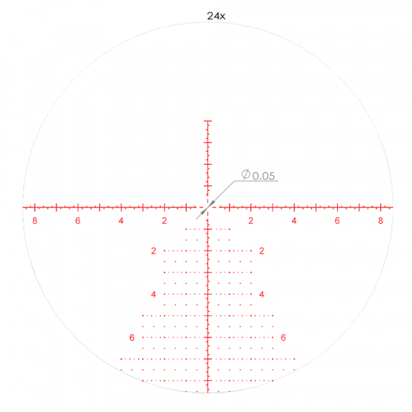 Прицельная сетка AM424. Благодаря расположению в первой фокальной плоскости, прицельная сетка AM424 изменяет свой масштаб пропорционально кратности. Простое T — образное перекрестие позволяет быстро захватить цель на минимальном увеличении 4-х, а хорошо различая на максимальной кратности информативная разметка по обеим осям с вертикальной «елочкой» позволяет оперативно внести поправки непосредственно перед выстрелом. Благодаря наличию сразу 11 уровней яркости подсветки, ARTELV LRS 4-24×56 FFP легко подстраивается под самые разные условия освещения. Для мгновенного отключения подсветки и оперативно возврата к предыдущему уровню яркости в конструкции барабанчика подсветки предусмотрены промежуточные положения.