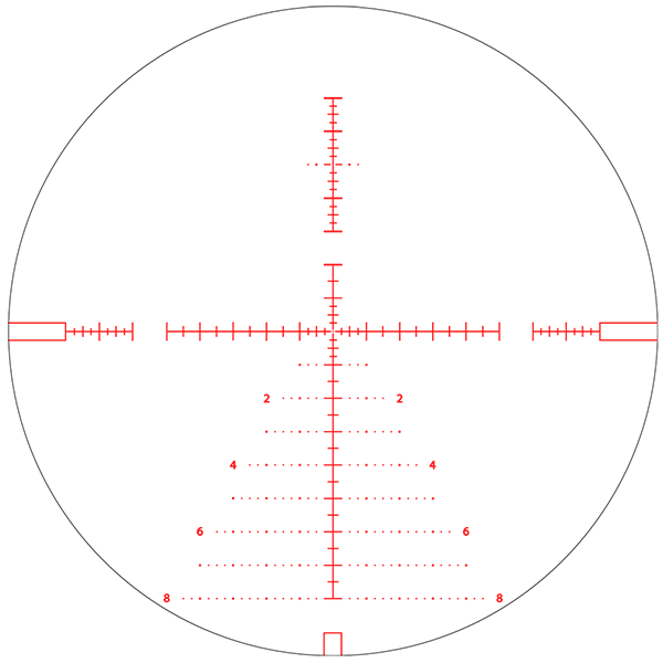 - Прицельная сетка AM3-20X. Прицельная марка расположена во второй фокальной плоскости окуляра, не изменяется в масштабе при переключении оптической кратности прицела. Марка обеспечивает высокоточную наводку на цель, даже при максимальном ее удалении и позволяет точно оценить расстояние до объекта.