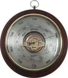 ПБ 8 - бытовой барометр открытого типа, позволяющий с высокой точностью определять величину атмосферного давления, а также контролировать ее изменение. На стрелочном циферблате большими цифрами прописаны две шкалы: mmHg – привычные всем миллиметры ртутного столба и hPa – гексопаскали. Значение погоды прописаны стильным шрифтом. Черная стрелка прибора указывает значение атмосферного давления, золотистая необходима для визуального контроля перепадов давления. Прибор выполнен из твердых пород дерева, для придания внешнего вида в соответствие канонам Барокко корпус обработан темным лаком. Вся механика, которая осуществляет замер атмосферного давления, изготовлена из латуни, поэтому барометр будет безотказно работать даже в местах постоянно повышенной влажности.