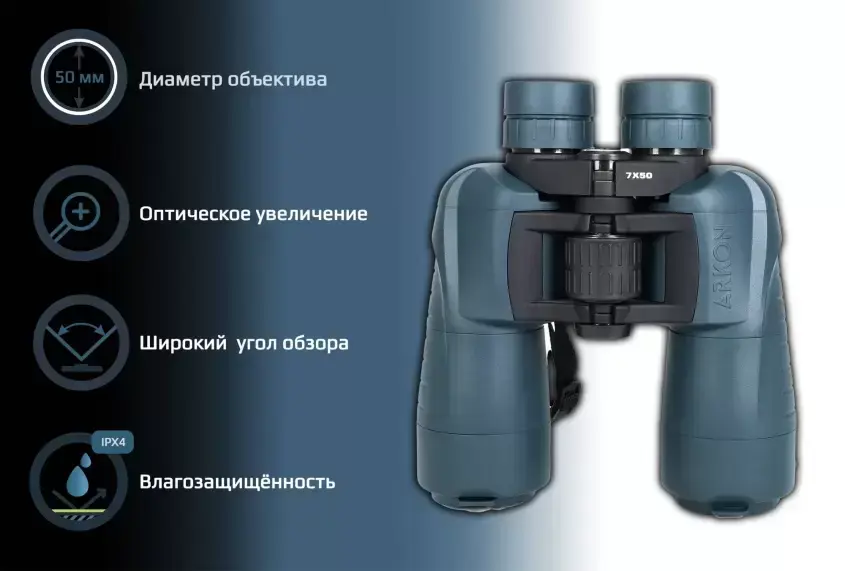 В оптической схеме бинокля Arkon 7x50 использованы призмы Porro, которые обеспечивают более объемное изображение. Благодаря своей разнесенной стереобазе пользователям значительно проще визуально оценивать расстояние к разным объектам.