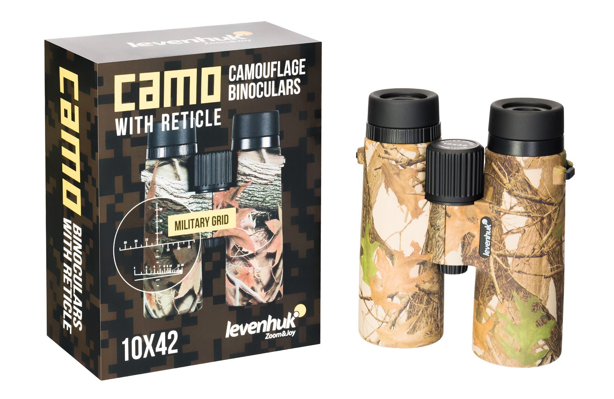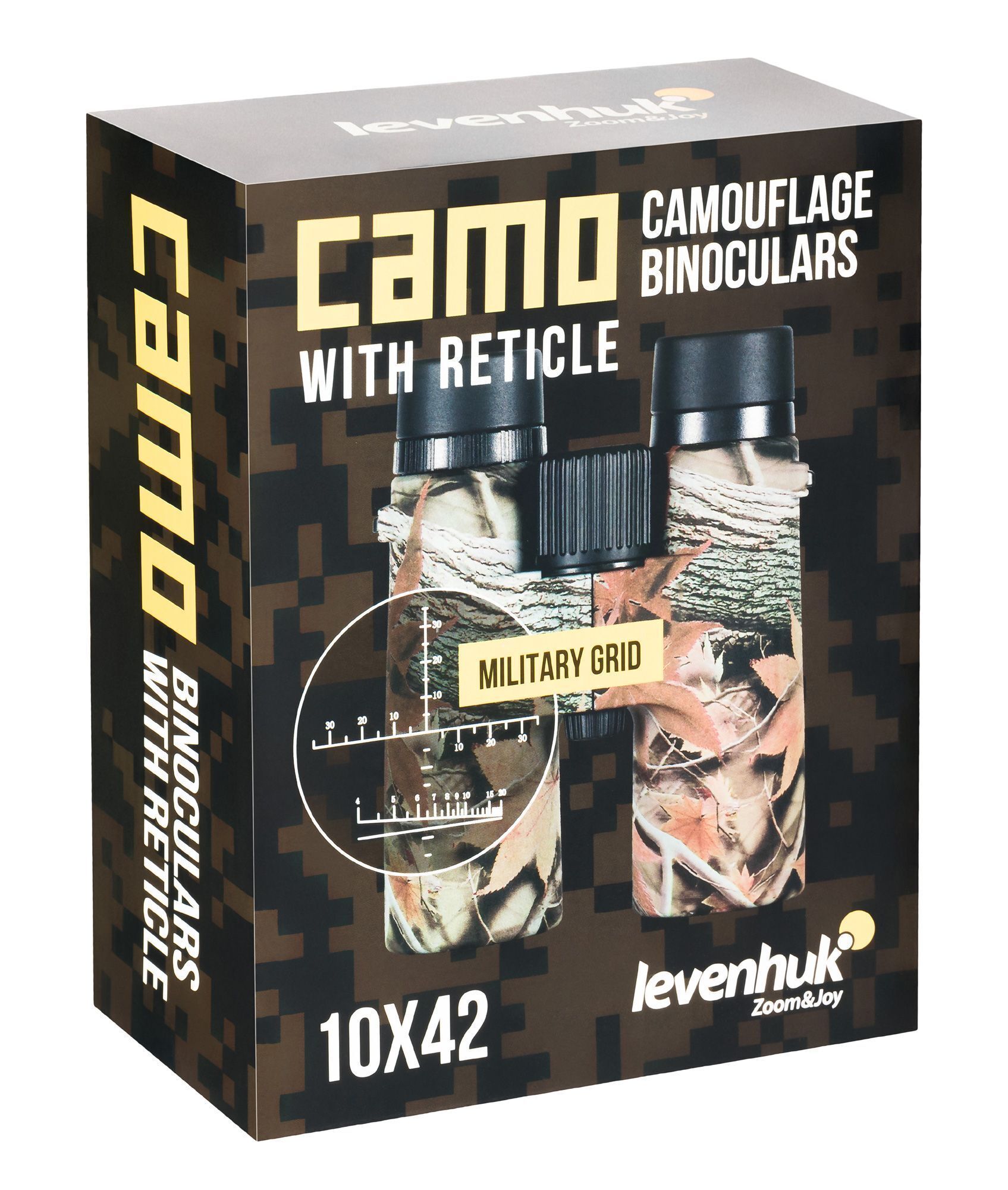 Levenhuk Camo Pine 10x42 – полевой бинокль с измерительными шкалами в окуляре, который высоко оценят любители охоты, тактических игр, спортивной стрельбы, рыбалки, туристических походов. Среди преимуществ модели – классическое сочетание 10-кратного увеличения и 42-миллиметровых объективов, прочный камуфлированный корпус, защита от пыли и воды. С помощью бинокля можно выследить добычу и определить расстояние до нее в широком диапазоне. Также доступны расчет примерных размеров цели и углов (горизонтального и вертикального).