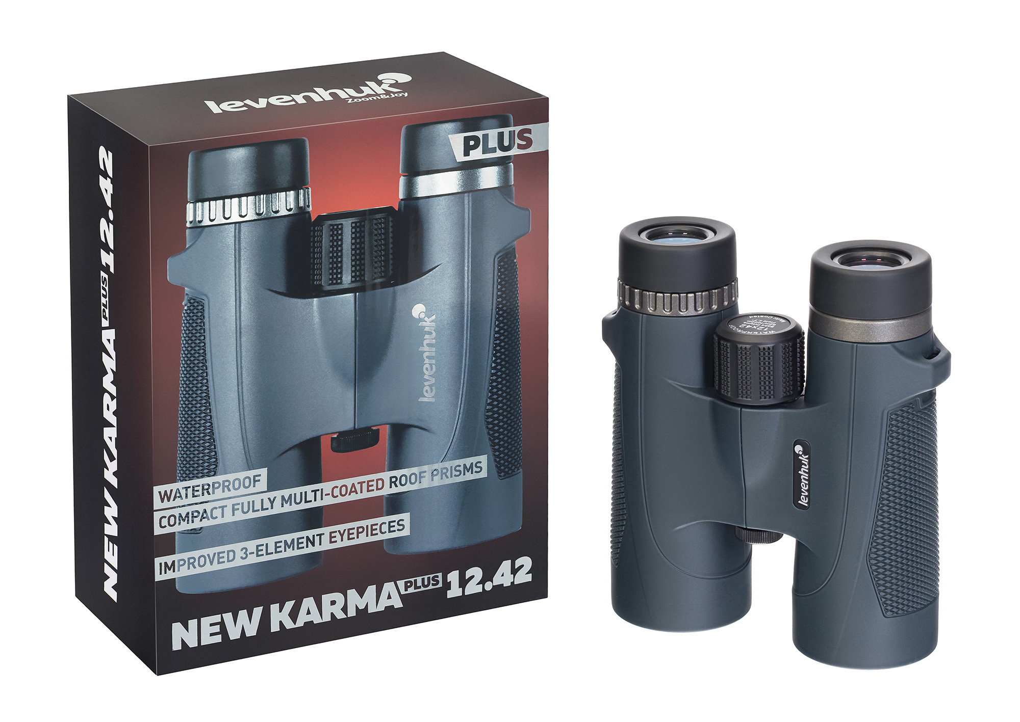 Levenhuk New Karma PLUS 12x42 имеет эргономичный дизайн и относительно небольшие размеры, его удобно переносить с собой и использовать из рук – этим прибор обязан построенной на roof-призмах оптической схеме. Корпус бинокля наполнен азотом, что защищает оптику от запотевания при скачках температуры или уровня влажности окружающей среды. Объективы состоят из трех элементов в двух группах и имеют апертуру 42 мм – это позволяет им эффективно захватывать достаточно света, чтобы пользователь мог наблюдать одинаково реалистичное и правдоподобное изображение в любых условиях. Стоит отметить и материал изготовления оптики – стекло BaK-4, имеющее высокий показатель преломления и формирующее ровный круглый выходной зрачок.