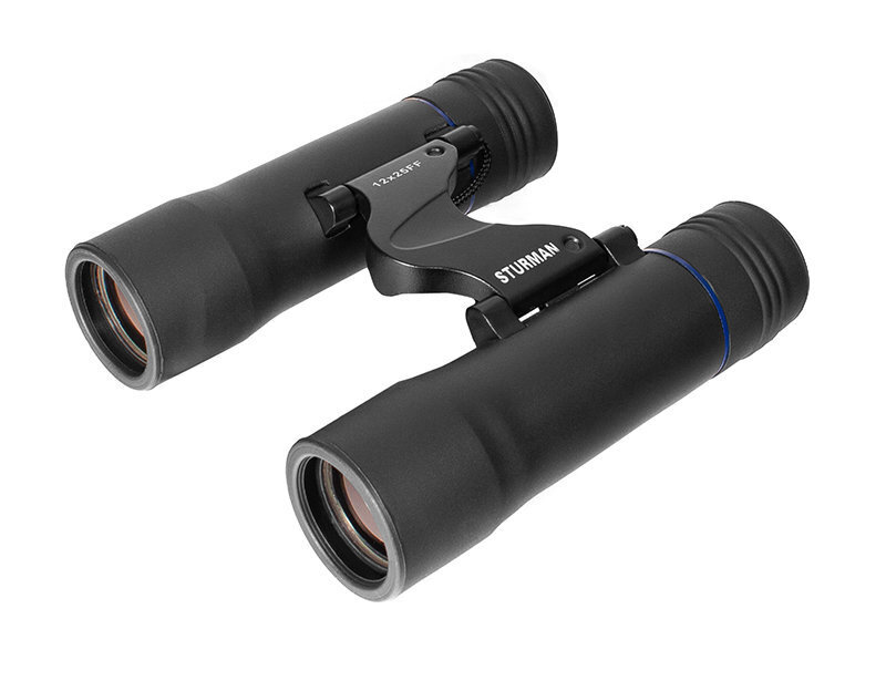 Бинокль Sturman 12x25 FF – это малый вес (менее 200 г) и компактность, эргономичный современный дизайн и хорошее качество картинки. Корпус спроектирован по типу «Open Hinge» или иначе «открытый шарнирный мост». Это позволяет в нерабочем состоянии удобно поместить бинокль в чехол или сумку, сложив (повернув на шарнирах) зрительные трубы к центральной оси, и минимизировать пространство для хранения.