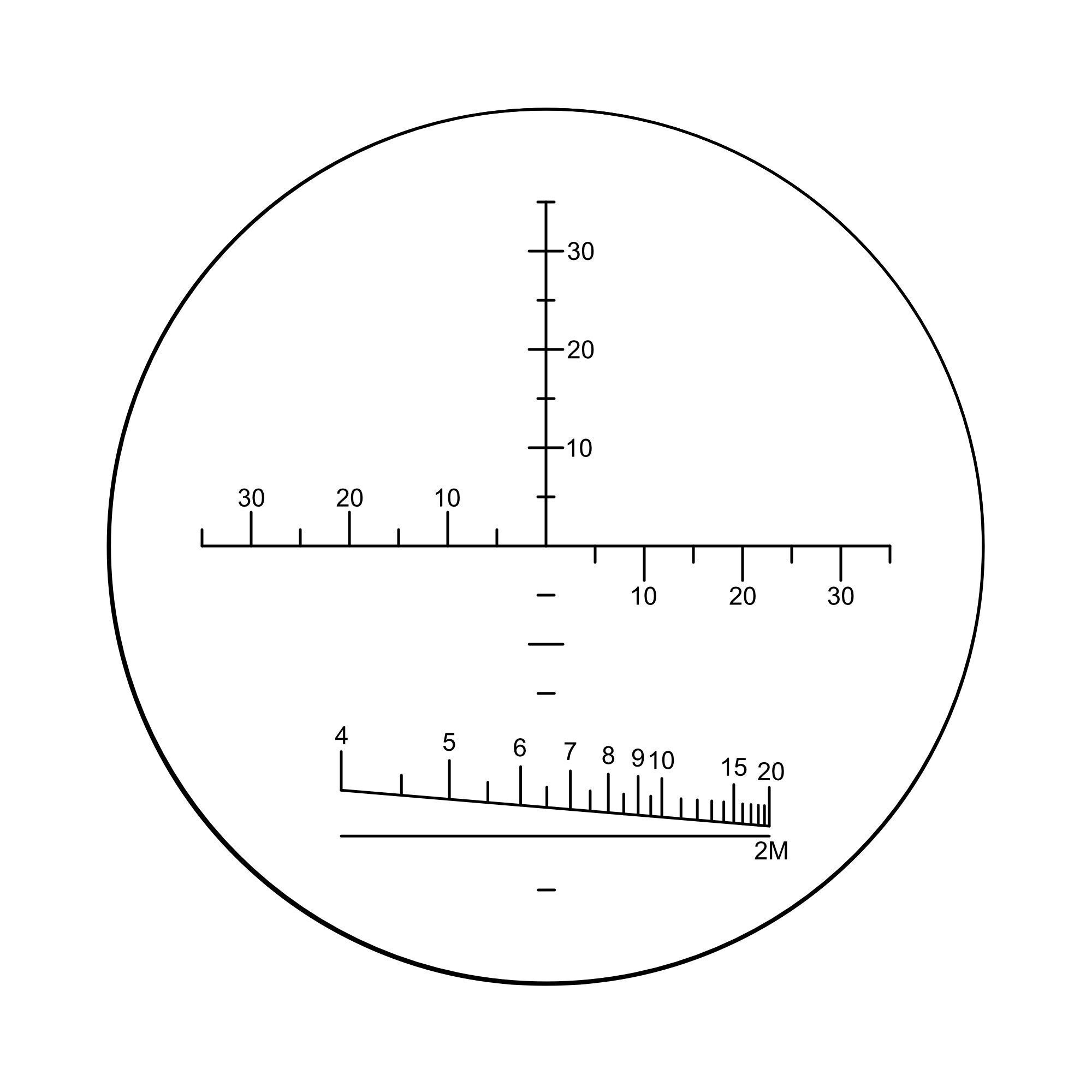 Дальномерная измерительная сетка в нижней части окуляра еще проще в использовании. С ее помощью можно быстро определить расстояния до целей с известной высотой 2 метра. Для этого необходимо поместить объект высотой 2 метра в поле зрения так, чтобы он точно помещался между верхней наклонной и нижней горизонтальной линией, и считать значение с наклонной шкалы. Умноженное на 100, оно даст расстояние до цели в метрах.