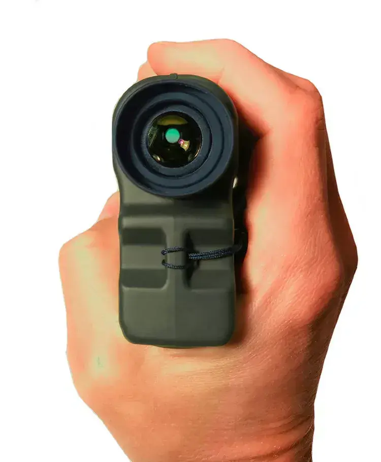 Лёгкий, компактный, морозостойкий. Дальномер весит 220 г, умещается в одной руке, даже ставится на штатив. Лёгкий прочный корпус выполнен из конструкционного пластика, а резиновые накладки чёрного цвета обеспечивают надёжный хват и комфортное использование. Прибор рассчитан на работу при температурах от -20°C до +50°C, так что может спокойно эксплуатироваться как летом, так и зимой.