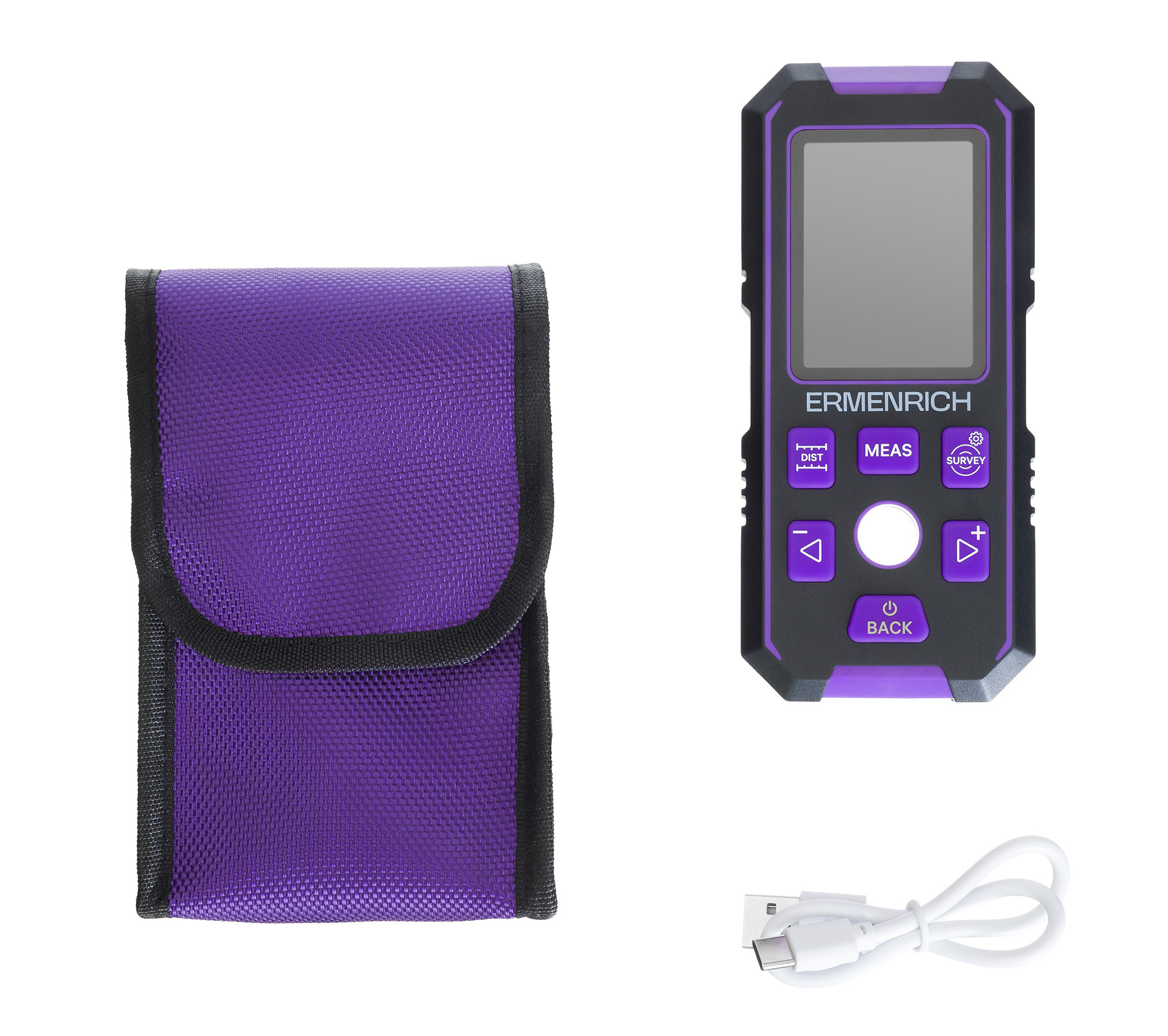 В детекторе Ermenrich Ping SM90 есть функция лазерной рулетки для измерения длины в диапазоне 0,2–40 м, доступно измерение в дюймах и футах. Предусмотрено два режима: единичное измерение или сканирование. Результаты замеров сохраняются во внутренней памяти детектора. По длине, ширине и высоте устройство автоматически вычисляет объем и площадь. С помощью функции «Пифагор» вычисляется длина стороны в прямоугольном треугольнике, например, для определения высоты объекта. Еще одна полезная функция – цифровой уровень для измерения углов от –90° до +90°.