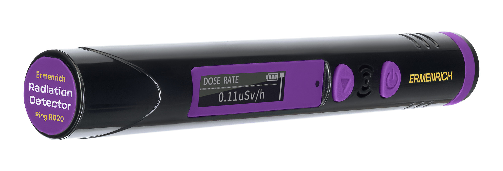 Дозиметр Ermenrich Ping RD20 совсем небольшого размера, но по функциональности не уступает обычным моделям. Он измеряет радиационный фон и помогает определить уровень гамма-, бета- и рентгеновского излучения в воде, продуктах питания, почве и различных объектах. В качестве датчика используется счетчик Гейгера-Мюллера. Диапазон измерения – от 0,05 мкЗв до 50 мЗв. Если допустимый уровень радиации будет превышен, дозиметр подаст сигнал звуком или светом.