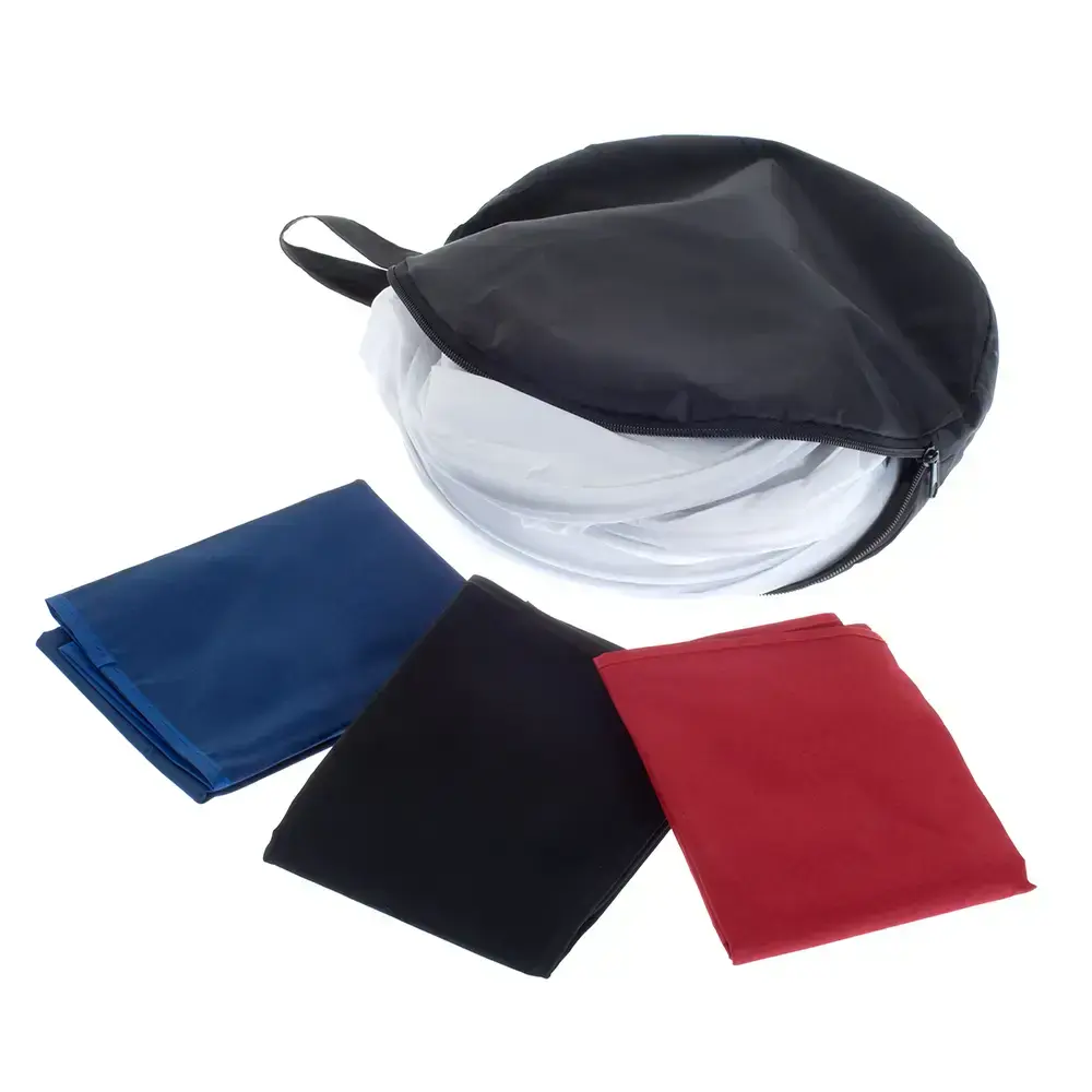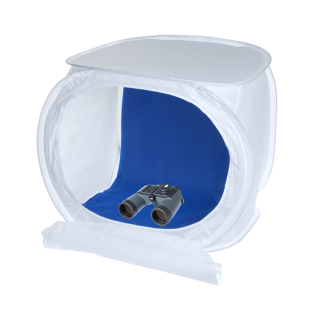 Стенки фотобокса выполнены из светопропускающей синтетической ткани, каркасом являются металлические пружины. Фотобокс быстро разбирается и имеет небольшой вес, что делает его удобным для использования не только в студии, но и для выездных съемок. В комплекте имеется набор бархатных фонов (красный, синий, черный, белый) и чехол для транспортировки.