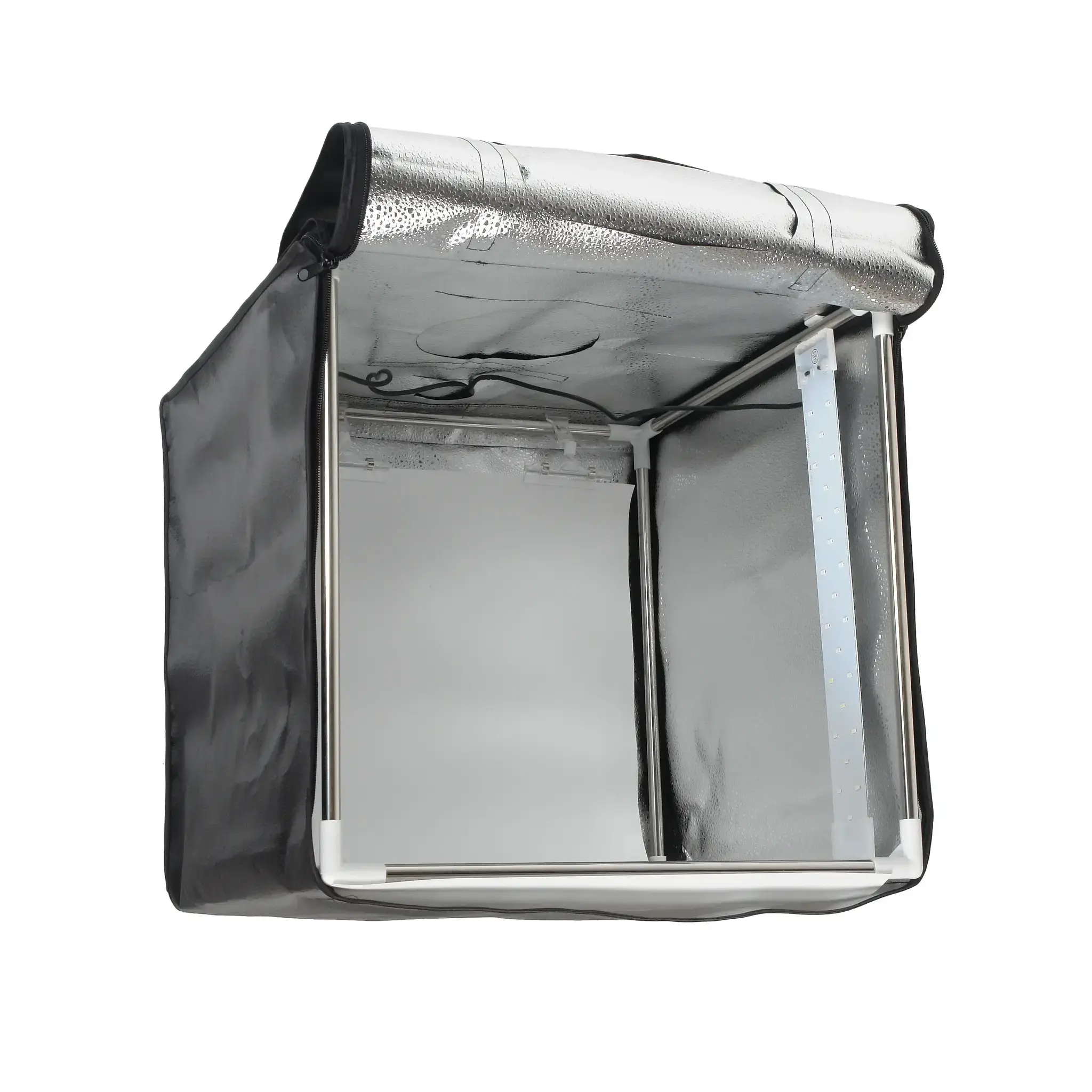 Тент фотобокса имеет два проема для камер (фронтальное 20?26 см и верхнее ? 15 см) и проем для кабелей ? 5 см. Также есть возможность откинуть одну из боковых частей тента.