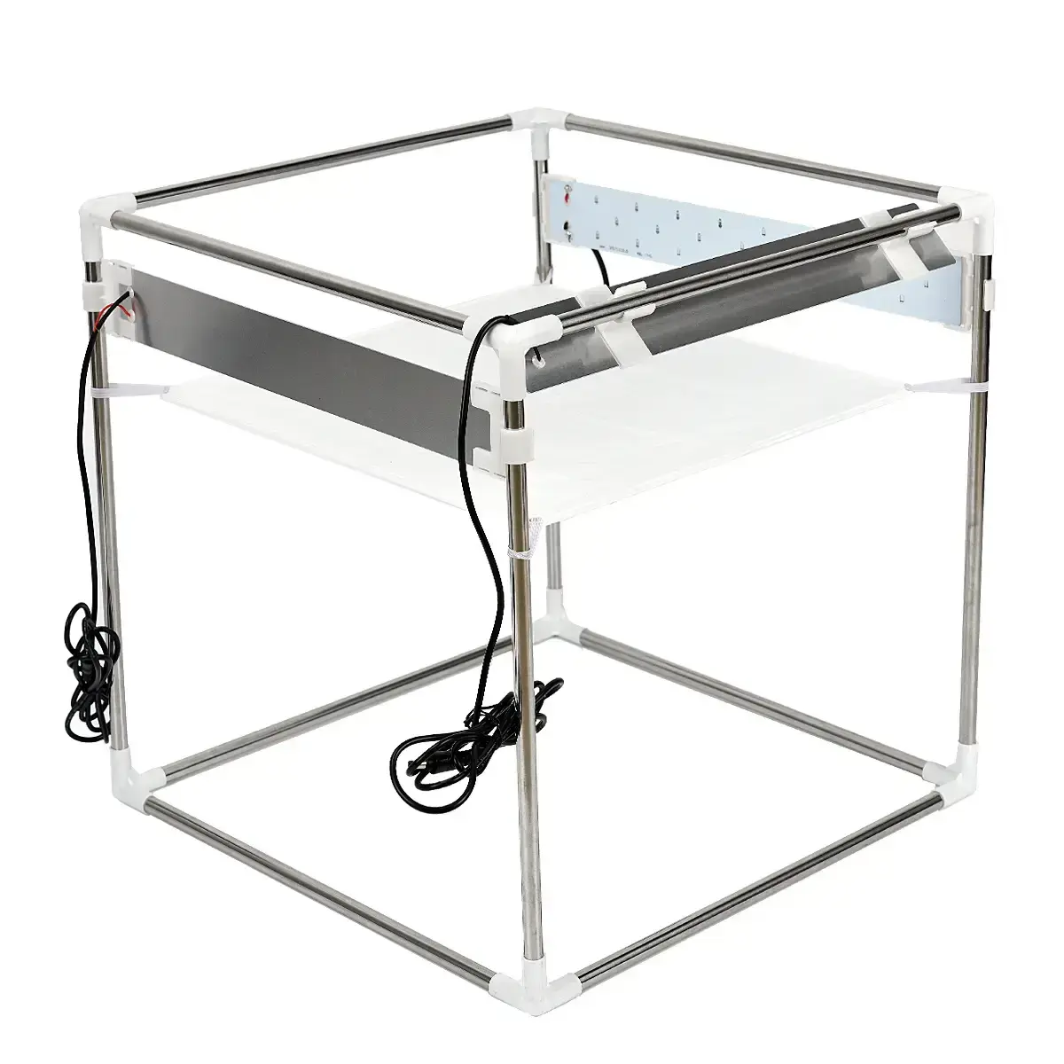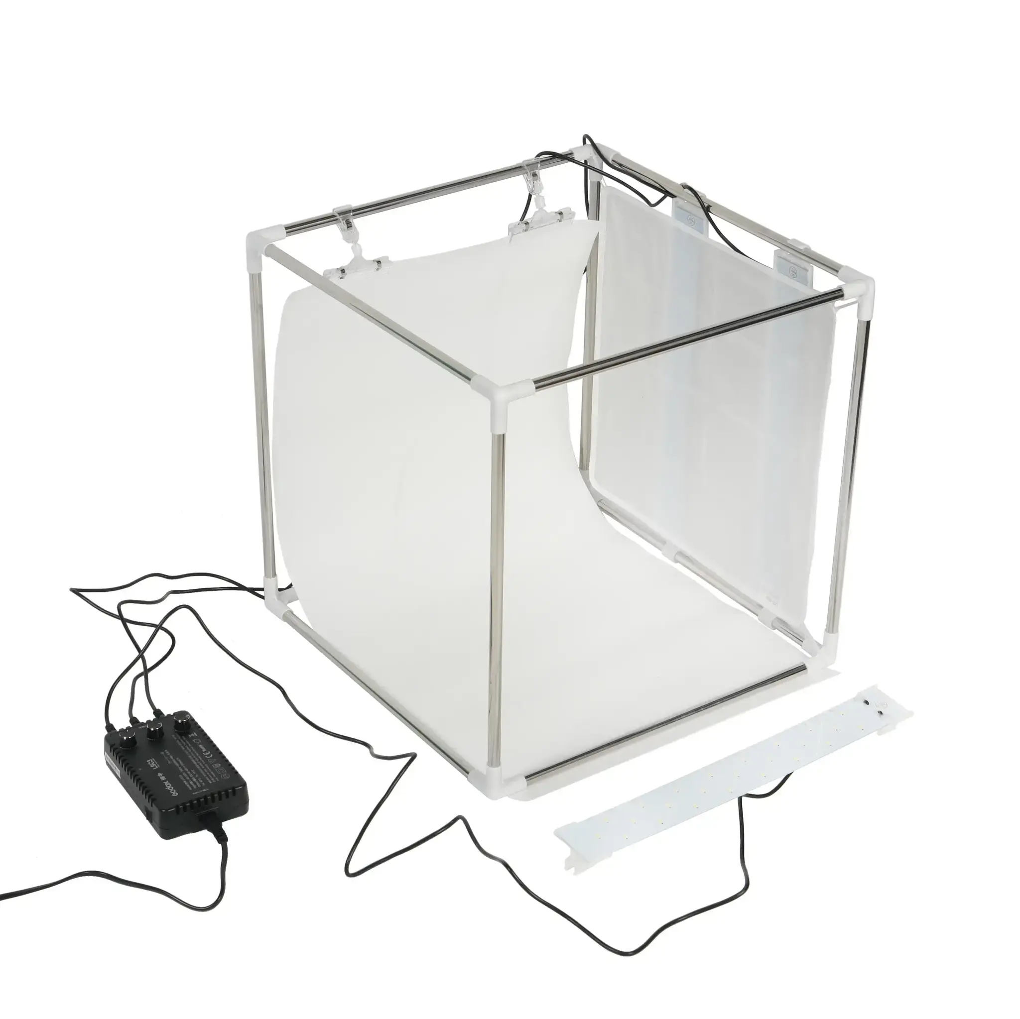 Светодиодные линейки могут крепиться вертикально или горизонтально к каркасу фотобокса, создавая различные световые схемы. Объект можно подсветить при помощи одной, двух или даже трех планок. Яркость каждой планки регулируется отдельно при помощи бесступенчатых диммеров, расположенных на блоке питания и управления.