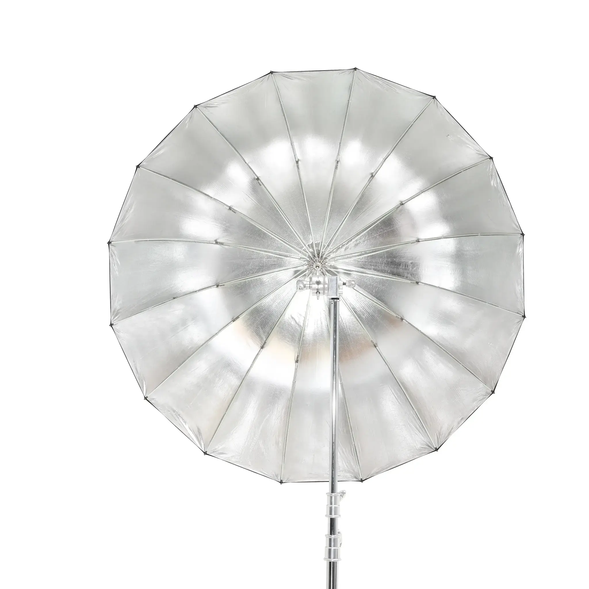 Фотобокс Godox UB-130S представляет собой глубокий зонт диаметром 130 см (51'') с черной внешней и внутренней серебристой отражающей параболической поверхностью. Зонт может использоваться совместно со студийными вспышками или светодиодными осветителями для получения направленного светового потока с резкой «неразмытой» границей пятна – для получения высококонтрастного изображения модели с четкими деталями. Фотозонт имеет практически круглую форму благодаря 16 спицам, отлично подойдет для портретной съемки.