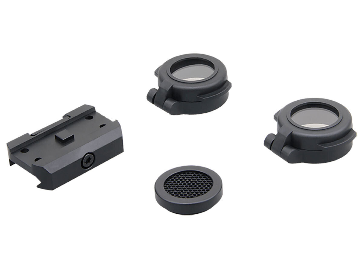 - Коллиматор поставляется в комплекте с двумя монтажными базами типа Weaver/Picatinny. Их фиксация на соответствующих планках осуществляется при помощи винтов, за счёт чего, установка и демонтаж занимают немного времени. Возможность выбора высокой или низкой базы позволяет монтировать устройство на оружие с различной компоновкой. При установке коллиматора на высокий кронштейн на некоторых видах оружия возможно использование механических прицельных приспособлений.