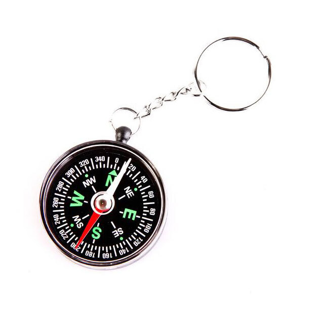 Туристический компас с цепочкой и кольцом, круглая капсула выполнена из пластмассы. Внутри капсулы размещена магнитная стрелка, на дне капсулы находится циферблат. На циферблате имеется шкала градусов с ценой деления 5˚ и индексы N, NE, E, SE, S, SW, W, NW (N-север, S-юг, E-восток, W-запад, NW-северо-запад, NE-северо-восток, SE-юго-восток, SW-юго-запад).