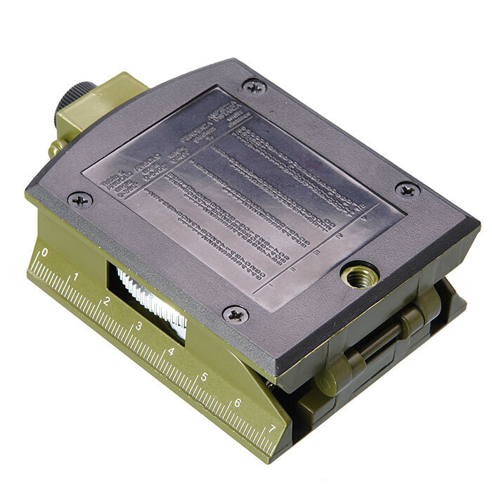 В окошке вытравлена угломерная шкала для определения расстояния между видимыми объектами, формулы приведены на задней стороне корпуса компаса.