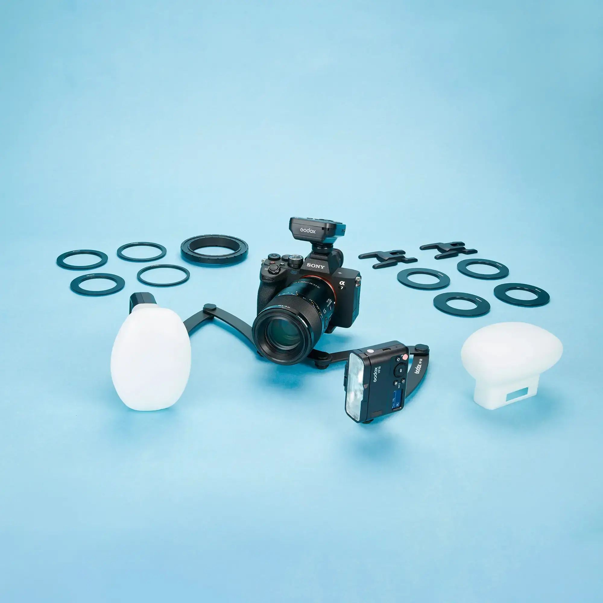 Комплект включает в себя две вспышки Godox MF12, радиосинхронизатор Godox XproII S+ для Sony, комплект переходных колец Godox AR-R Kit и монтажное кольцо Godox MF-R для установки вспышек на объектив фотоаппарата.