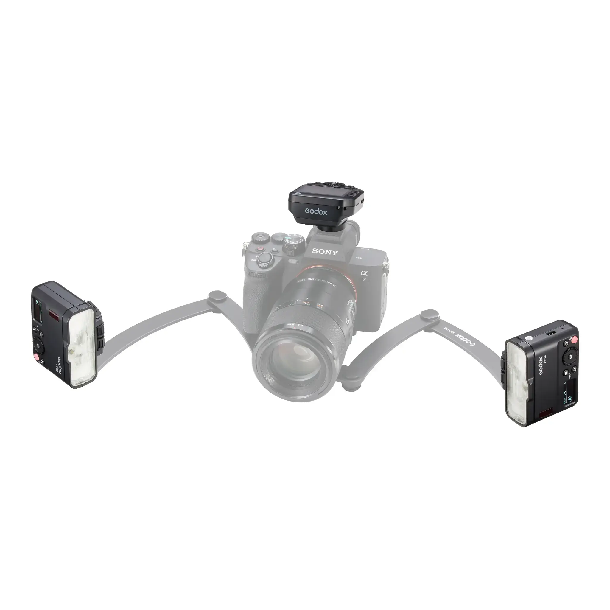 Комплект Godox MF12-DK1 обеспечивает вариативность установки системы: вспышки можно расположить на объективе, установить на специальный кронштейн (приобретается отдельно), а также расположить их в любом месте с помощью мини-штативов (подставок) или адаптеров «холодный башмак».