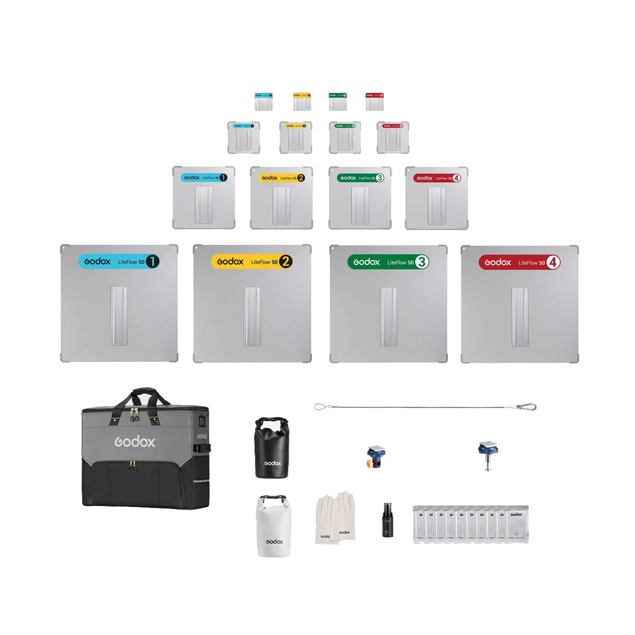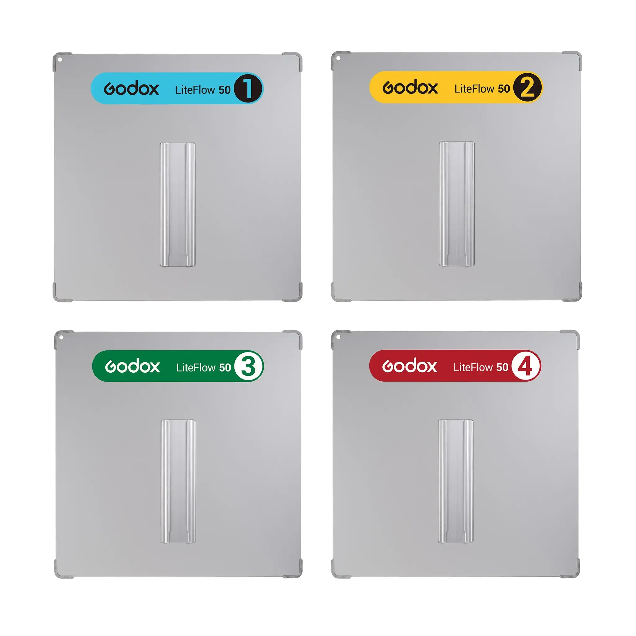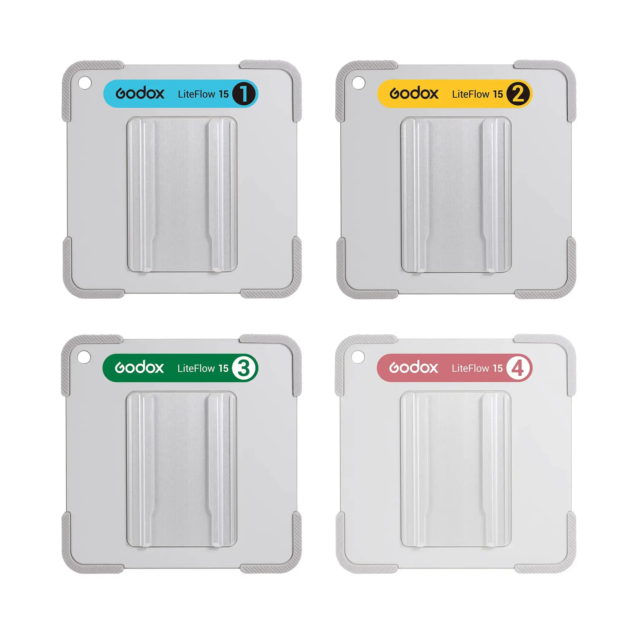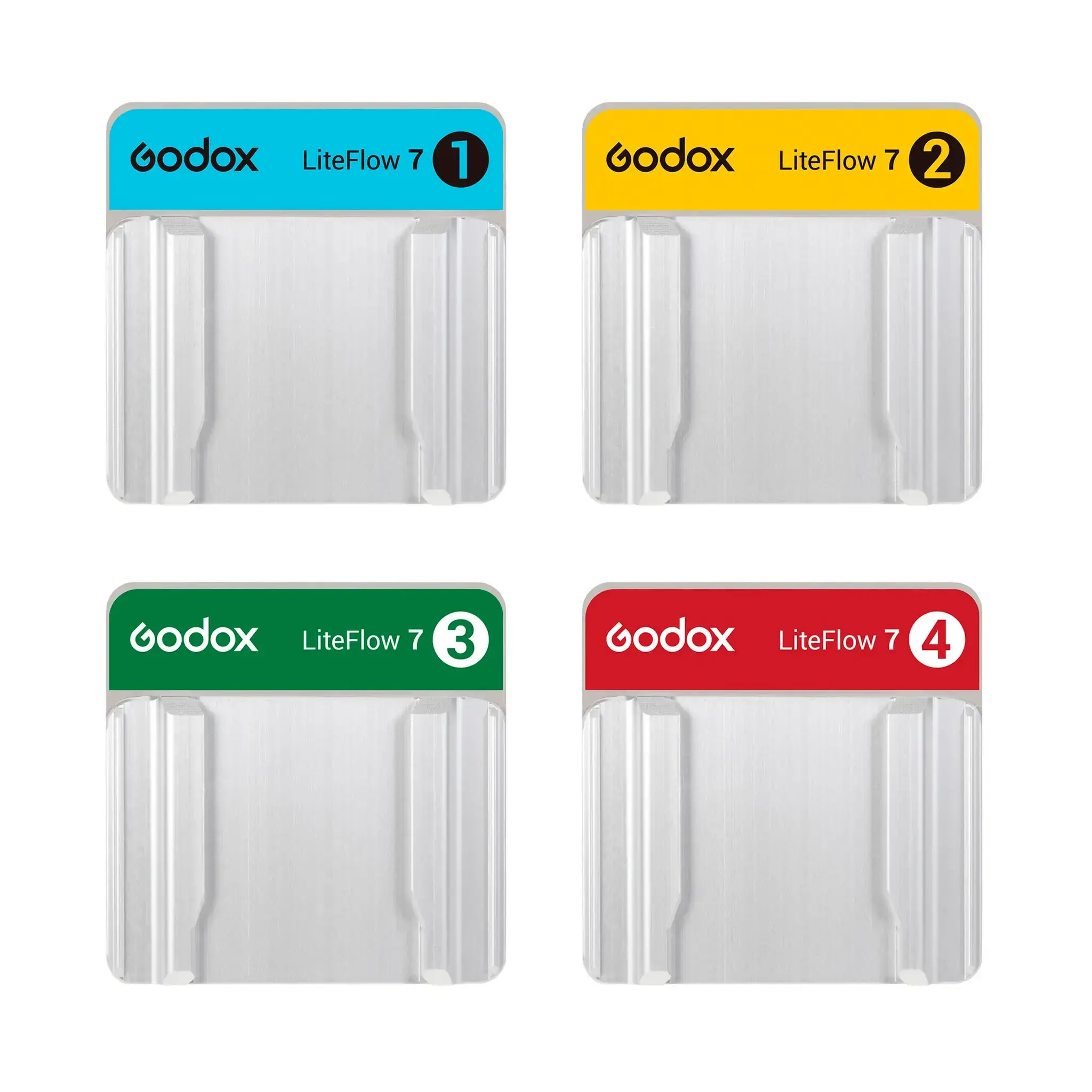 Система LiteFlow, разработанная для улучшения рабочего процесса на съемочной площадке, имеет цветовую маркировку на задней панели. Каждый цвет и номер соответствуют определенному типу диффузии и отражения для быстрой идентификации.