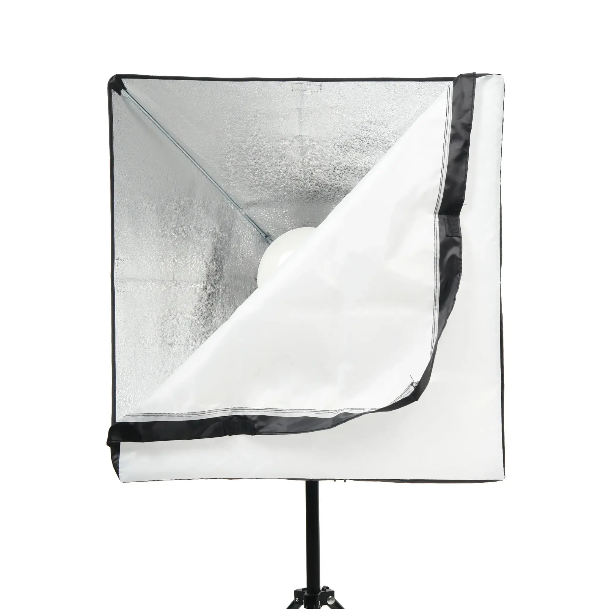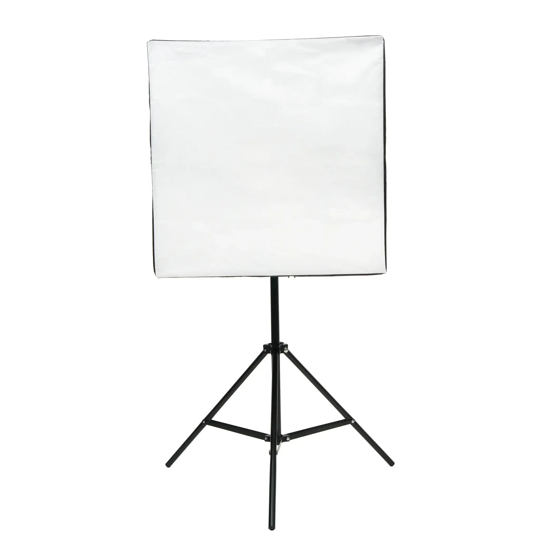 Прямоугольный несъемный cофтбокс размером 50х50 см и глубиной 46 см прикреплен к корпусу осветителя. Чтобы раскрыть софтбокс, достаточно потянуть кольцо вверх. Купол софтбокса изготавливается из специальной синтетической ткани с серебристой светоотражающей внутренней поверхностью, используемый как рефлектор. В комплект софтбокса входит внешний тканевый рассеиватель, который одевается на передний край софтбокса и приклеивается на липучку.