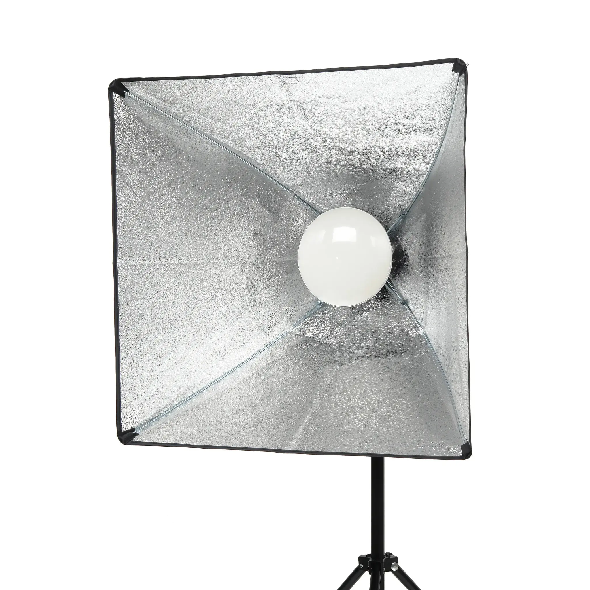 Студийный осветитель LH-E27х1 со светодиодной лампой ML-45 LED выдает световой поток с мощностью 45 Вт, цветовой температурой 5500 К и цветопередачей CRI>90. Матовая пластиковая колба-рефлектор лампы (диаметром 15 см) рассеивает световой поток, обеспечивая равномерное заполнение софтбокса светом. Поэтому допустимо использование софтбокса без тканевого рассеивателя.
