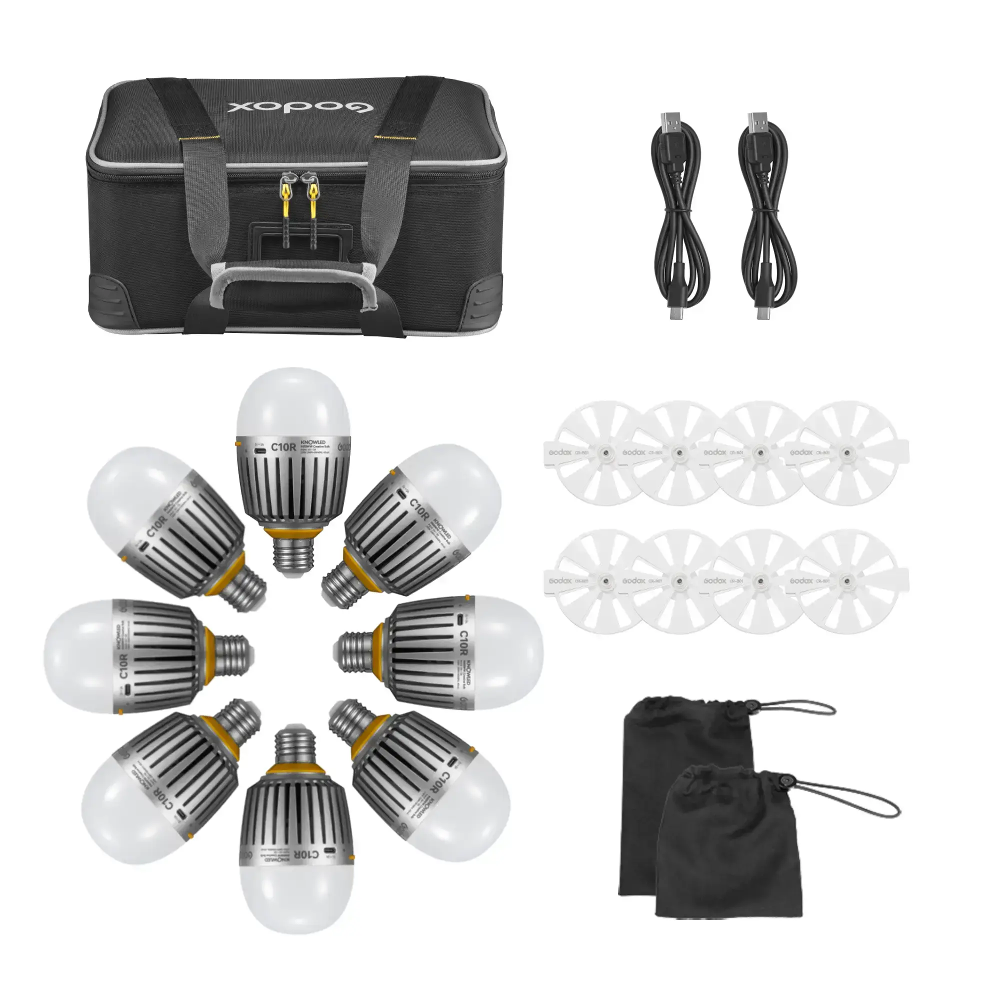Godox Knowled C10R-K8 – это комплект, включающий в себя восемь уникальных ярких RGBWW-осветителей Godox Knowled C10R. В комплектацию также входят – кейс для транспортировки и хранения восьми ламп и отражатели-рассеиватели для каждой лампы.