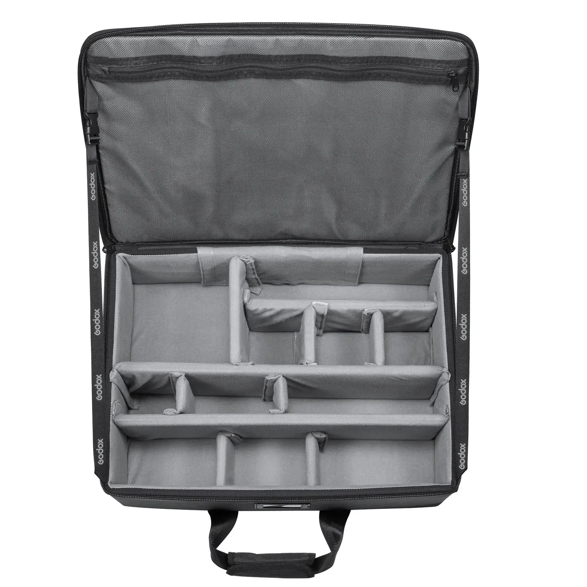 Сумка-кейс Godox CB33 на молнии с двумя ручками и наплечным ремнем вмещает все предметы комплекта. Внутренние размеры CB-33 составляют 52x36x18 см, пространство разделено переставными перегородками. Внешние размеры компактны – 55x39x24 см.