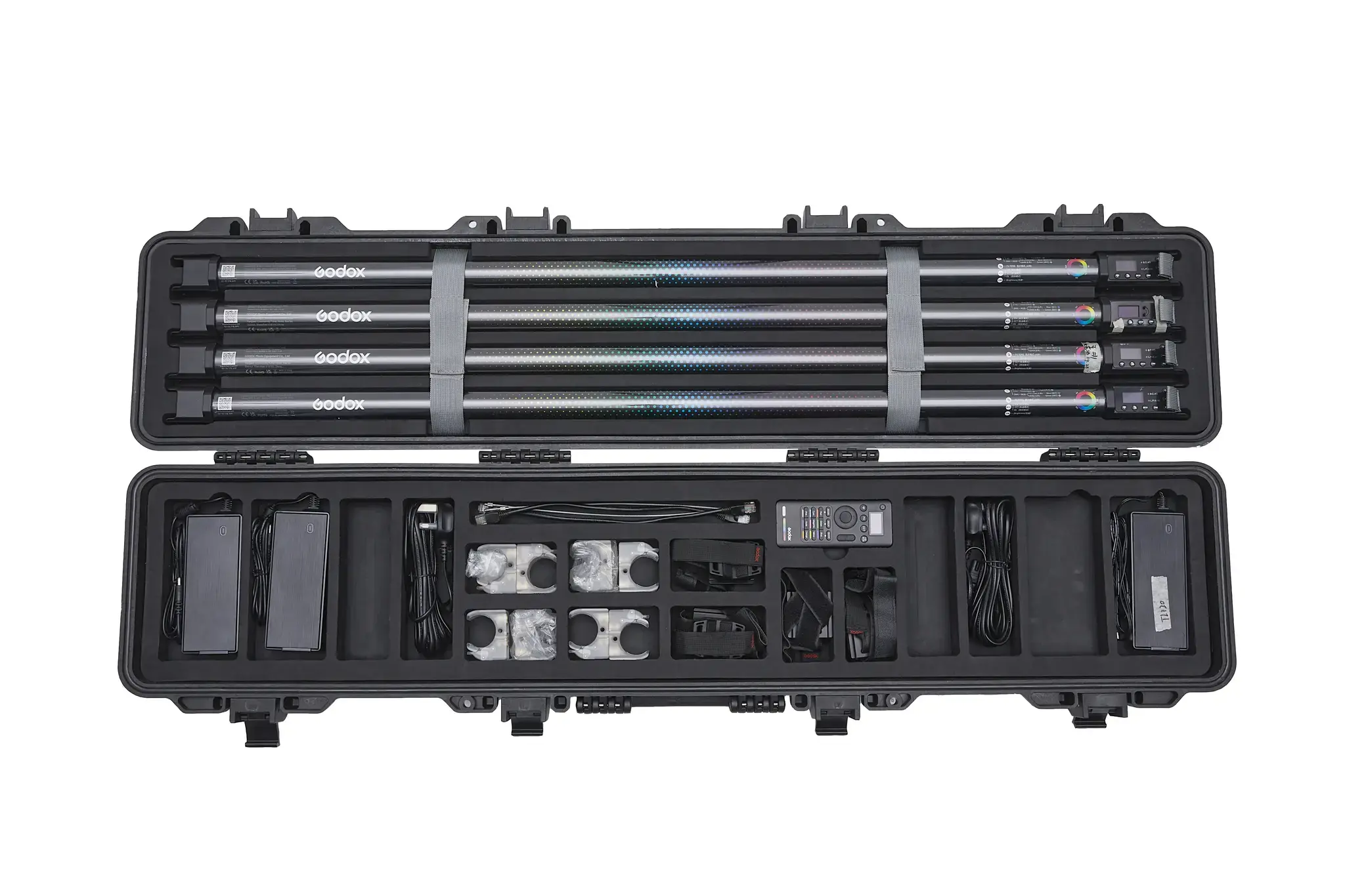 Комплект светодиодных осветителей Godox TL120-K4 kit – это комплект, включающий в себя четыре легкие и компактные световые трубки Godox TL120, выдающие яркий световой поток мощностью до 30 Вт в режиме bi-color с цветовой температурой 2700~6500К или цветной световой поток режиме RGB/HIS/FX (спецэффектов), пульт дистанционного управления осветителями Godox RC-R9, аксессуары для крепления или подвешивания осветителей и кейс CB47 для хранения и транспортировки.