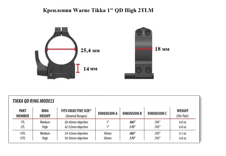 | Основные ТТХ | Быстросъемные крепления Warne прицелов 1” для Tikka (2TLM QD) |