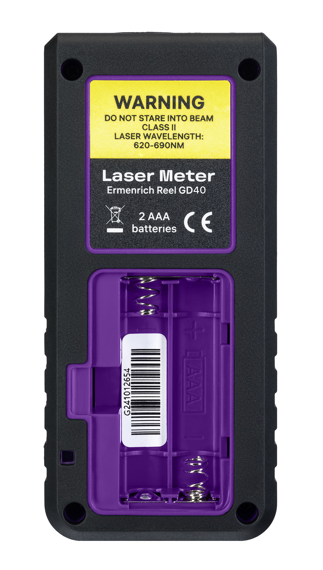 Данные измерений и расчетов выводятся на ЖК-экран с тремя строками, в памяти устройства одновременно хранится до 20 групп данных. Максимальное расстояние, доступное для измерения рулеткой Ermenrich Reel PLUS GD40, составляет 40 метров. Прибор легко удерживается одной рукой, эргономично расположенные кнопки облегчают управление. Питание устройства осуществляется от 2 батареек ААА, один комплект обеспечивает более 5000 измерений. Предусмотрены беззвучный режим работы и функция автоотключения.