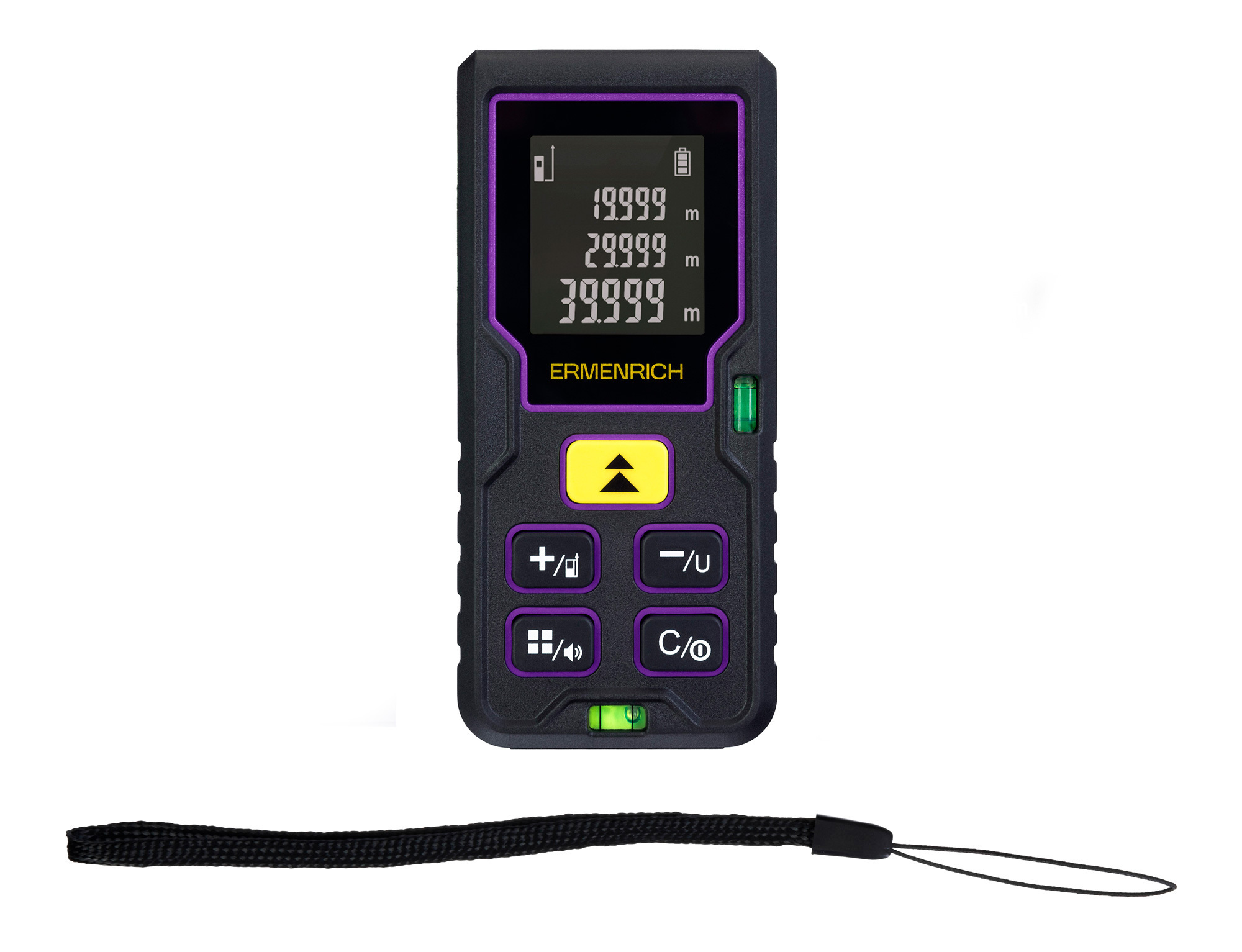 Ermenrich Reel PLUS GD40 – лазерная рулетка, которая найдет самое широкое применение при измерении линейных размеров, площадей и объемов помещений, зданий и сооружений. Ее возможности пригодятся при монтаже сборных конструкций, подгонке деталей большого размера и проч. Рулетка осуществляет измерения в ручном и автоматическом режимах. Также устройство производит расчеты необходимых параметров на основе косвенных данных измерений (функция «Пифагор»), что облегчает работу в стесненных условиях и помещениях сложной формы.