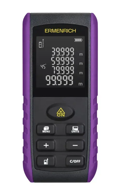 Ermenrich Reel PRO GE80 – многофункциональная лазерная рулетка, которая поможет решить множество задач в строительстве, ремонте и быте. Ее назначение – измерение расстояний, углов, вычисление объема и площади объекта. Особенно полезной будет функция «Пифагор» – с ее помощью можно вычислять расстояние по косвенным замерам, если не получается направить лазер в нужную точку напрямую.