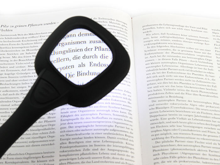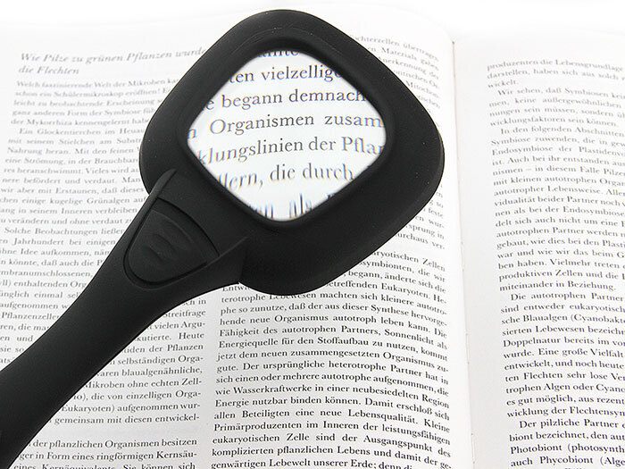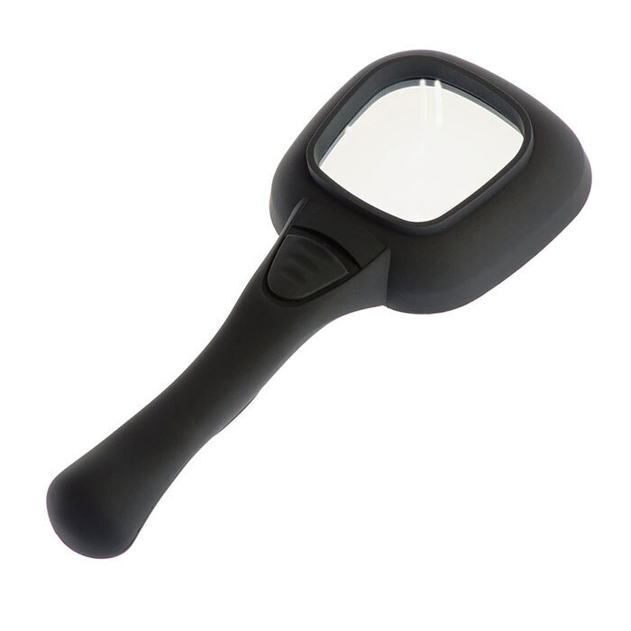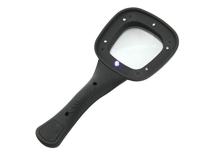 Лупа с увеличением 3x в черном пластиковом корпусе. По периметру оправы линзы расположены 6 светодиодов -5 для подсветки и 1 для проверки водяных знаков. С обратной стороны изогнутой 12 см ручки расположен переключатель режимов освещения.