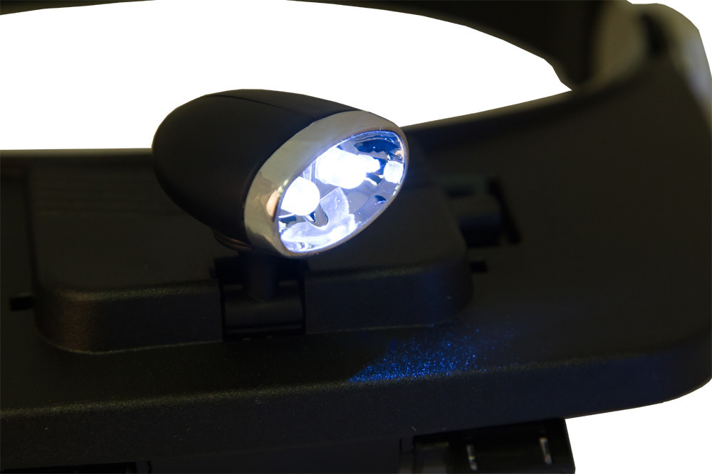Лупа Levenhuk Zeno Vizor H3 имеет встроенную подсветку. Светодиоды точно направляют пучок света на рабочую область и позволяют работать даже в темных помещениях. Для работы подсветки необходимы две батарейки типа ААА.