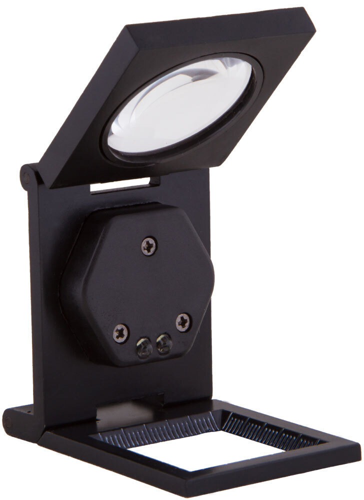 Линза сделана из стекла и закреплена на штативе. Угол ее наклона можно регулировать. Благодаря диаметру в 30 мм вам будет удобно работать даже с протяженными предметами. Увеличение линзы составляет 6 крат. Штатив металлический, устойчивый и надежный. На нем установлены два светодиода, так что лупу можно использовать даже в полной темноте. Подсветка работает от батареек, ее яркость можно регулировать.