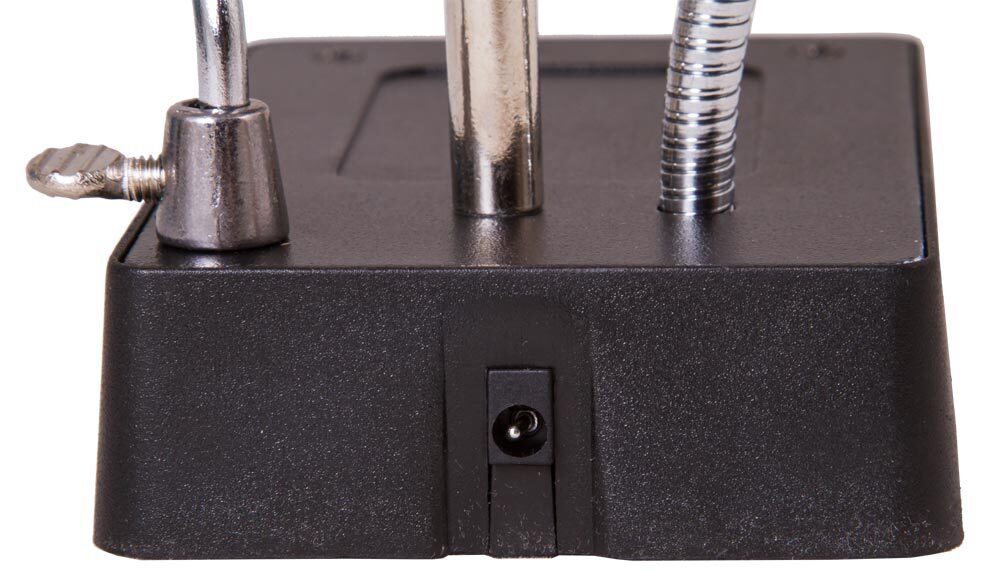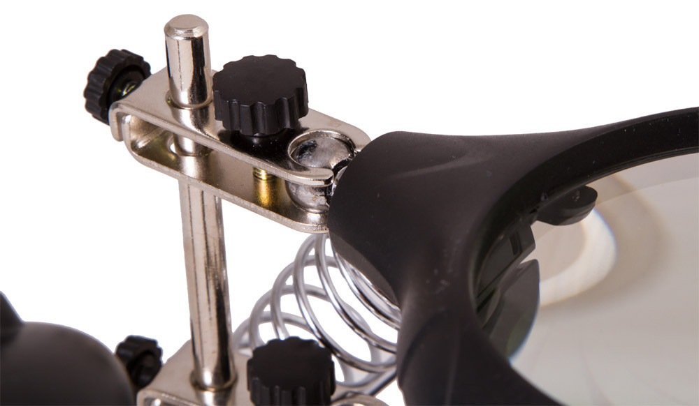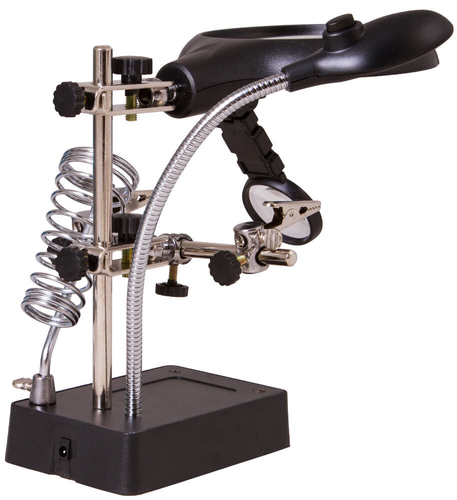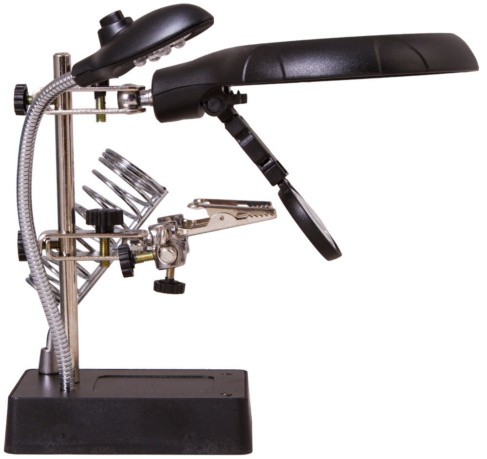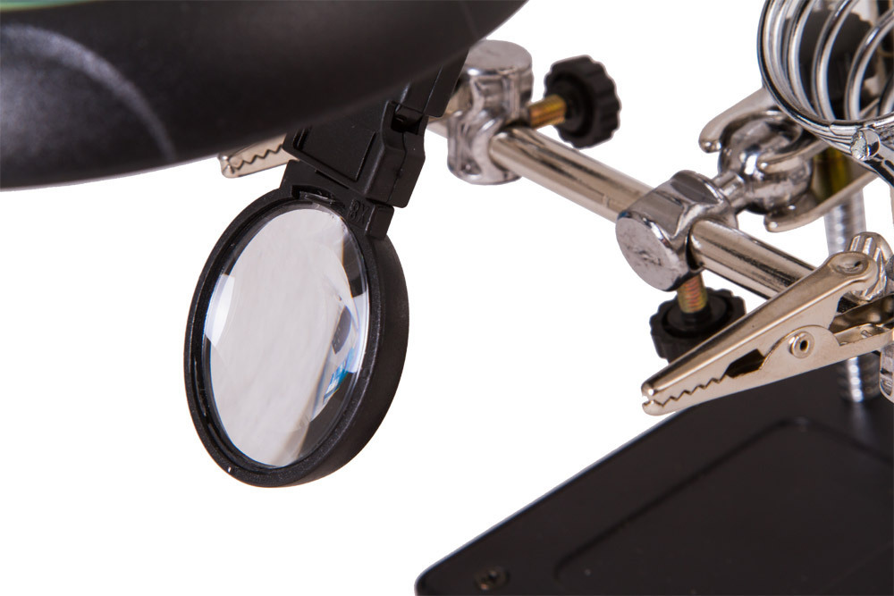 Под линзами вы найдете специальные держатели для небольших деталей – их называют «третья рука». Они предназначены для длительной работы с платами и масштабными моделями. Рядом расположен и держатель для паяльника. Все держатели съемные.