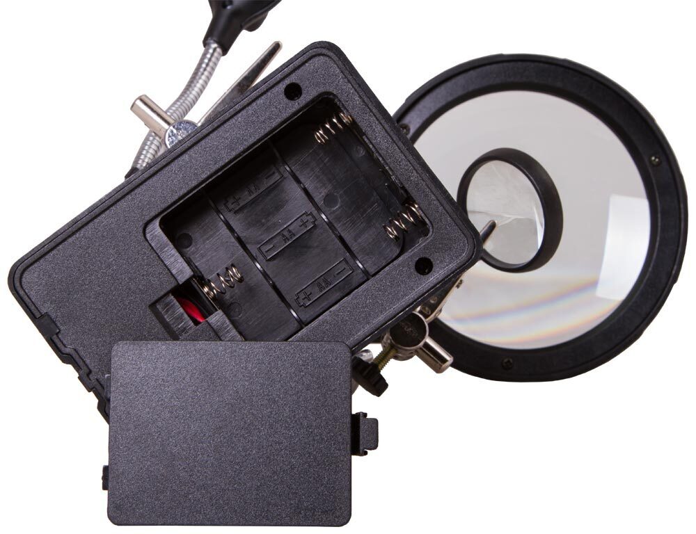 Две линзы из оптического пластика расположены друг под другом. Их можно использовать вместе или по отдельности. Рядом на гибком штативе закреплена подсветка. Она состоит из 5 ярких светодиодов и равномерно освещает рабочую область. Для ее питания необходимы батарейки или подключение к сети переменного тока.