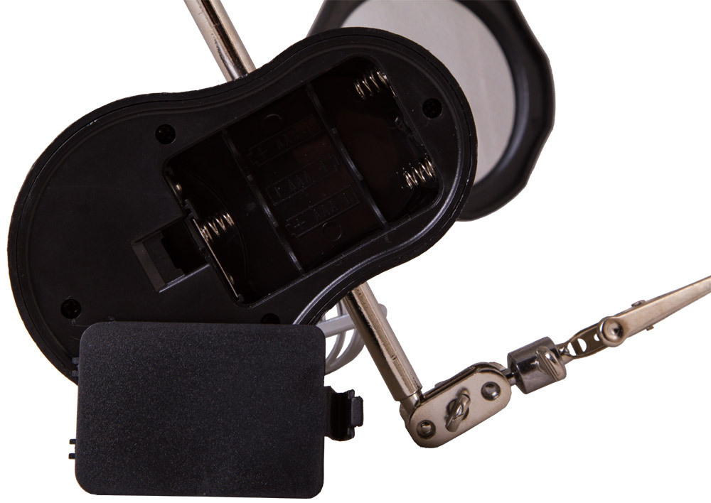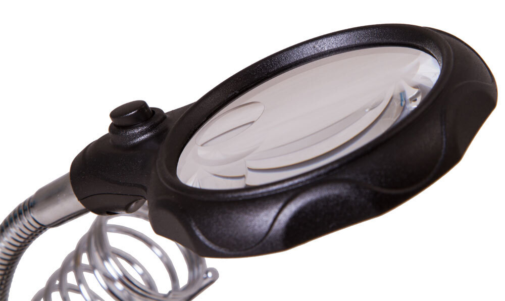Бифокальная линза дает два увеличения. На большом диаметре кратность составляет 3,5х, на малом – 12х. Лупа зафиксирована на гибком штативе и снабжена встроенной подсветкой, состоящей из двух ярких светодиодов. Выключатель подсветки расположен у основания линзы.