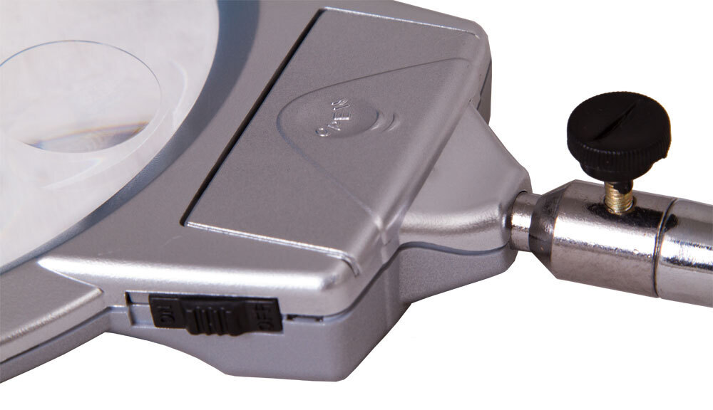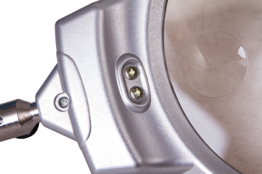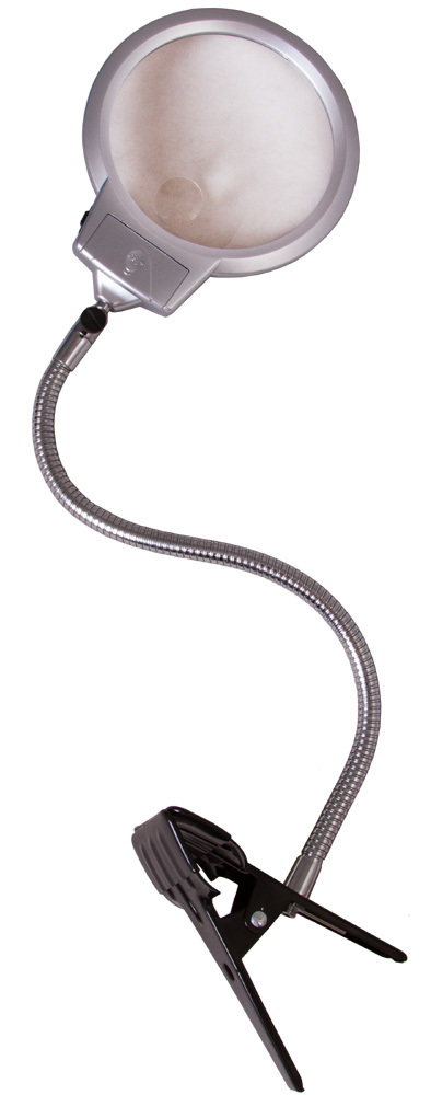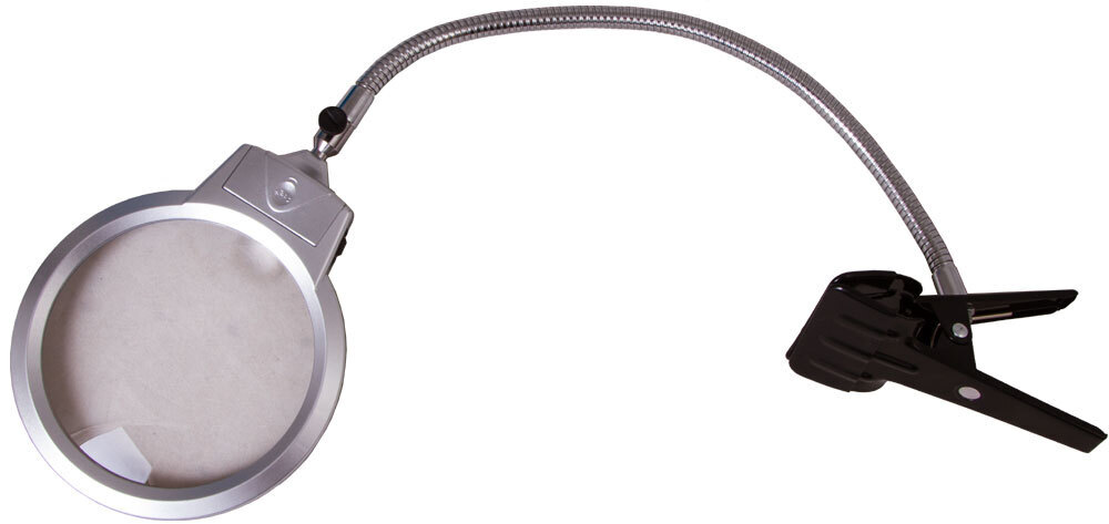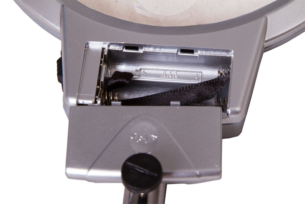 С помощью держателя-прищепки лупу удобно фиксировать на столе, полке или даже дверце шкафа. Встроенная подсветка поможет проводить наблюдения в слабо освещенных помещениях. Она состоит из 2 светодиодов, которые установлены в оправе линзы. Для включения подсветки используется переключатель на корпусе.