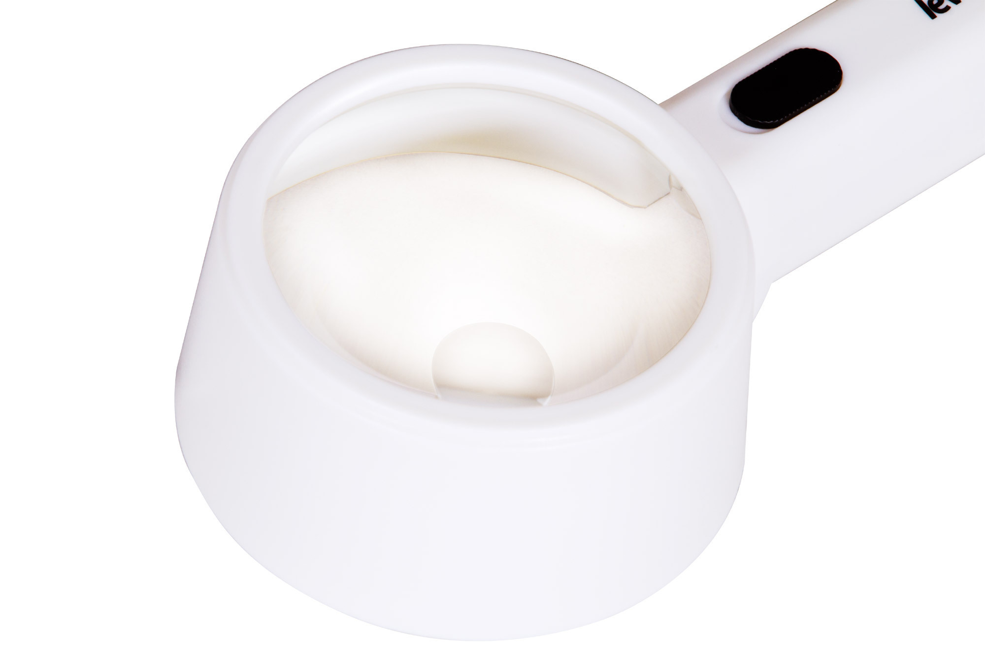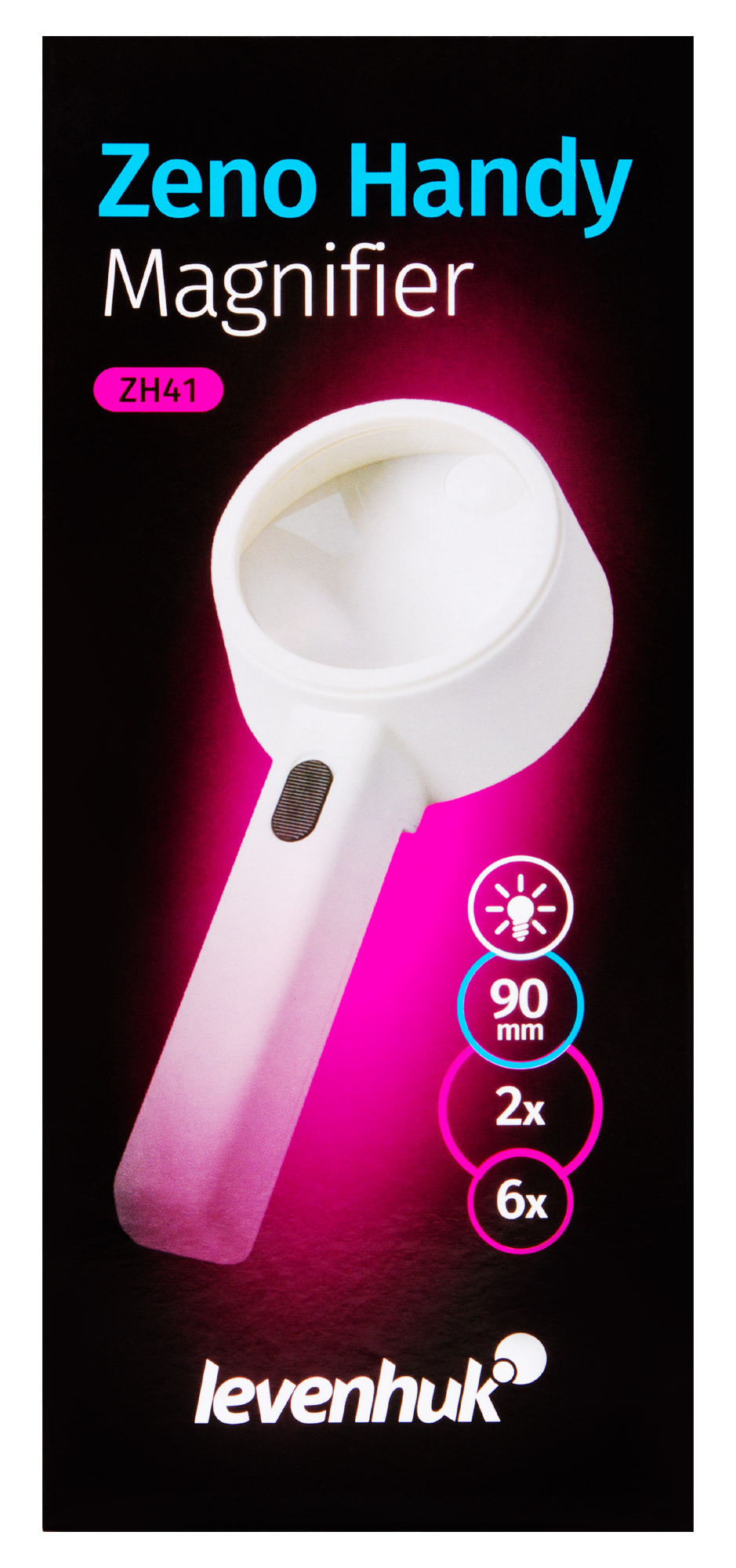 Лупа Levenhuk Zeno Handy ZH41 предназначена для рассматривания мелких объектов и поверхностных дефектов, чтения текстов и изучения карт и чертежей. В лупе установлена бифокальная линза, которая по основному диаметру (90 мм) дает увеличение в 2 крата, а по дополнительному (21 мм) – в 6 крат. У лупы есть подсветка, которая работает от батареек (нет в комплекте).