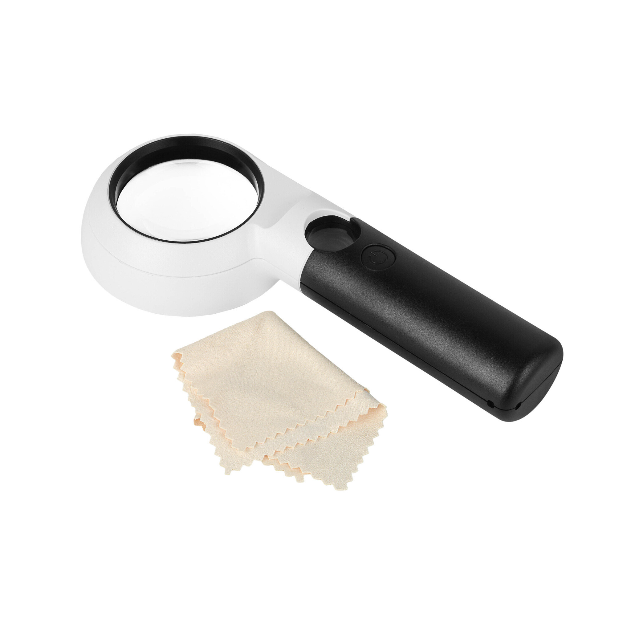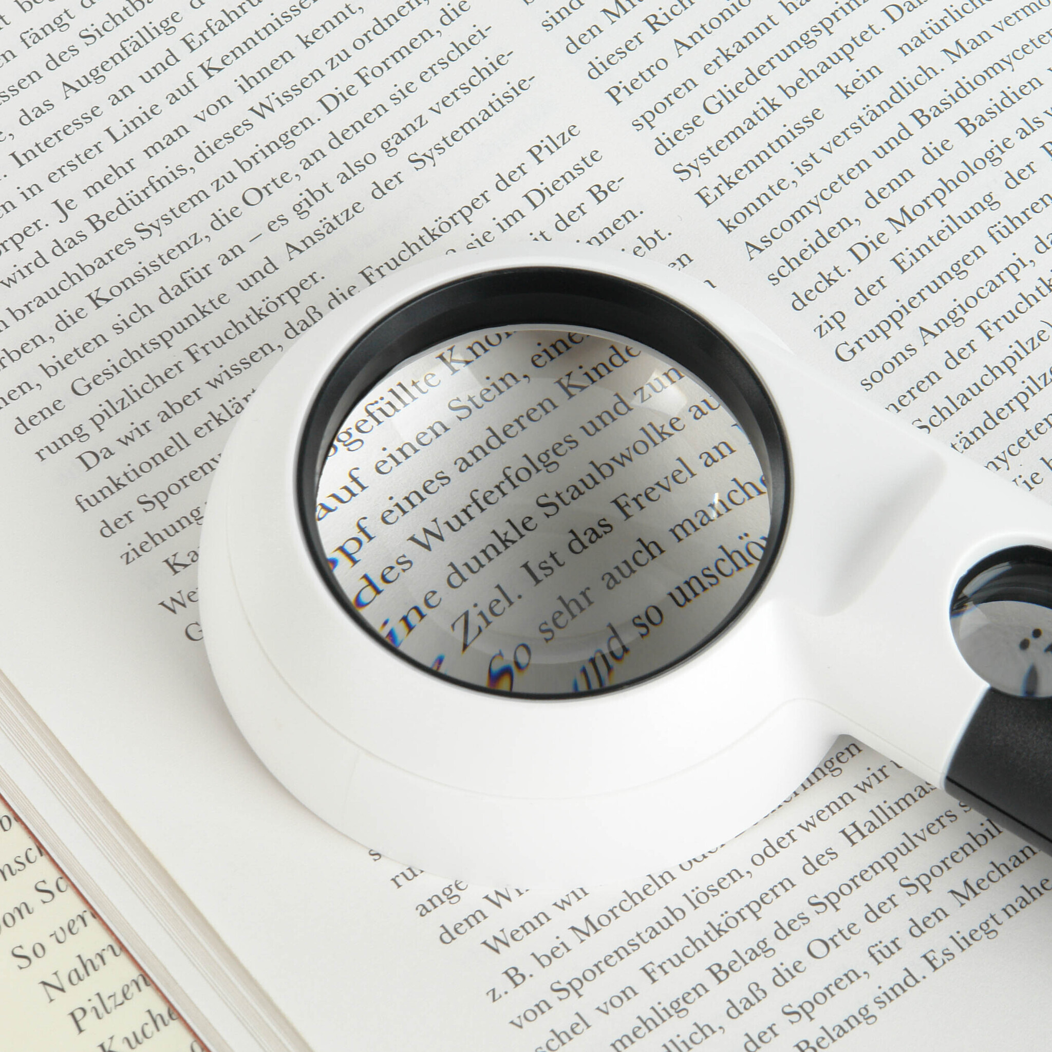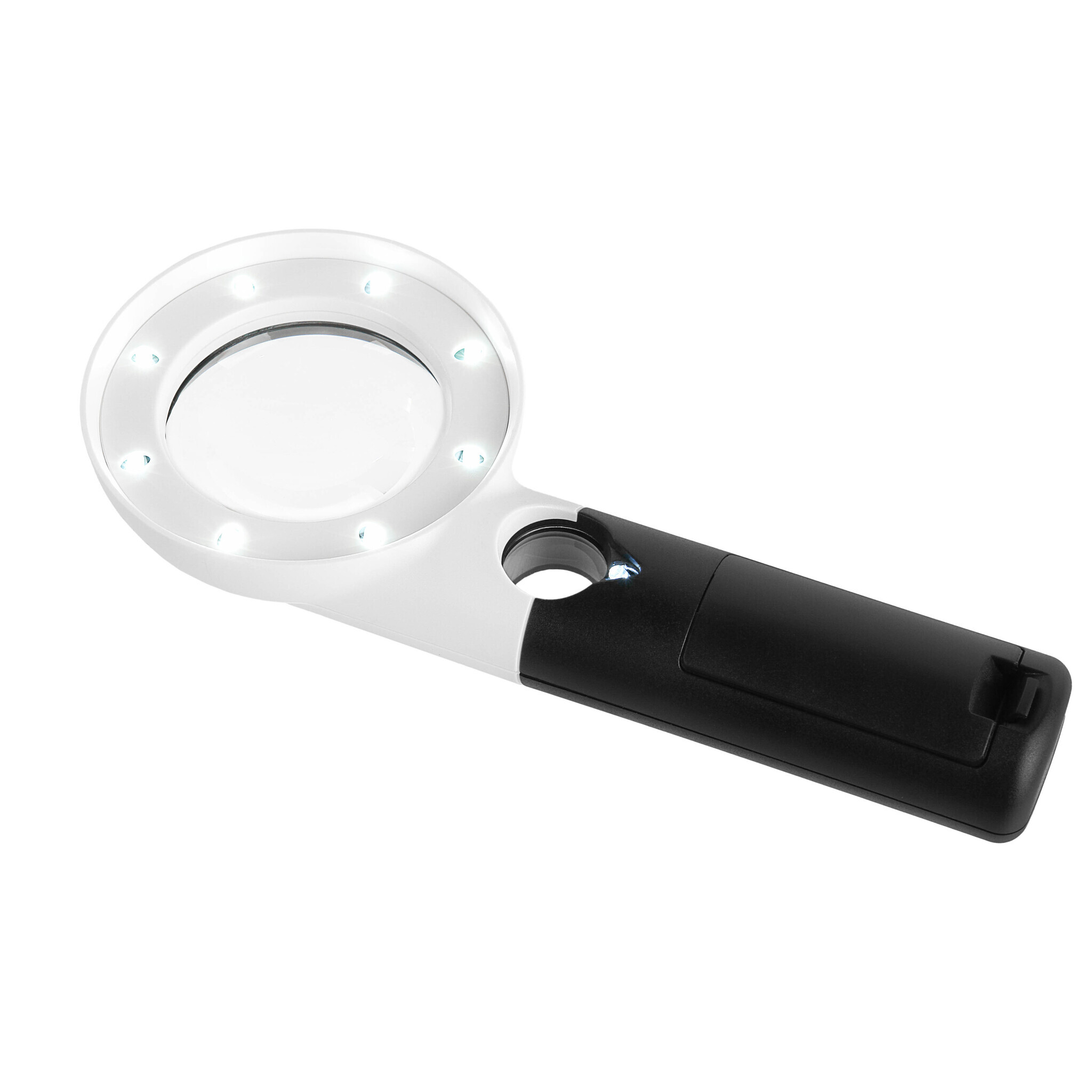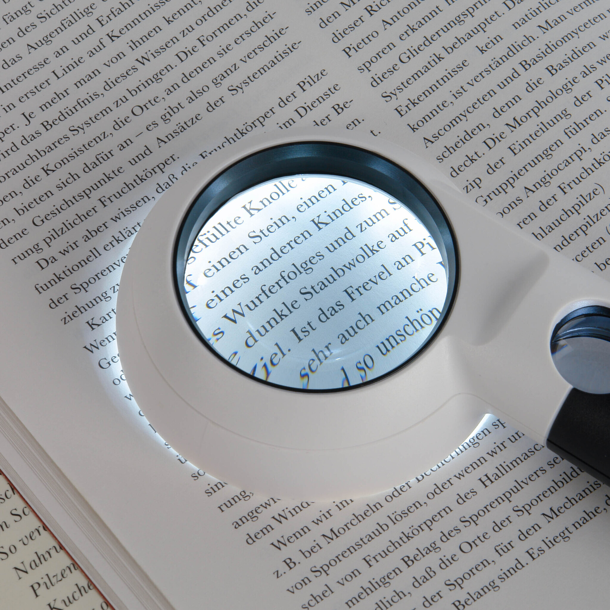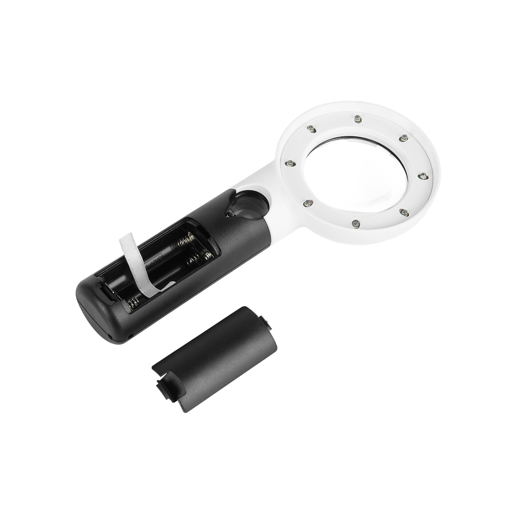Лупу удобно использовать как при дневном свете, так и с включенной светодиодной LED подсветкой. Вокруг основной линзы расположено восемь светодиодов, обеспечивающих равномерное освещение объекта. Вспомогательная линза оснащена отдельной светодиодной лампочкой, которая точно освещает центральную область.