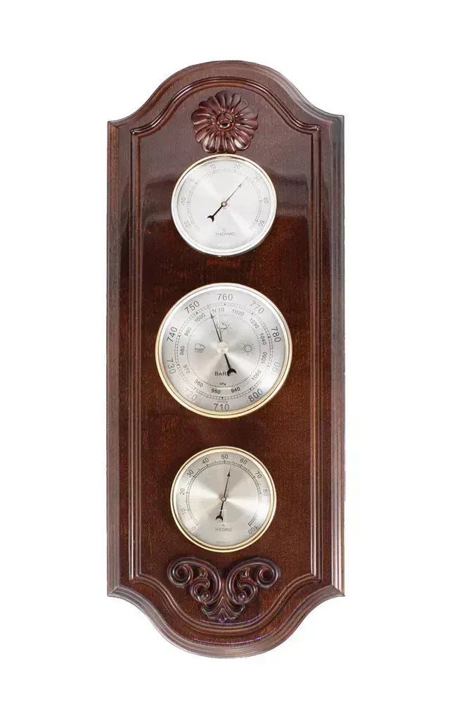 Измерительная механика приборов комнатной метеостанции М 47 выполнена из неподверженных коррозии материалов, соответственно, может смело эксплуатироваться в помещениях, расположенных в регионах с высокой влажностью воздуха. Корпус настенной метеостанции изготовлен из цельного массива дерева. Домашняя метеостанция М 47 - высокоточный измерительный комплекс, состоящий из отдельных приборов измеряющих физические величины: