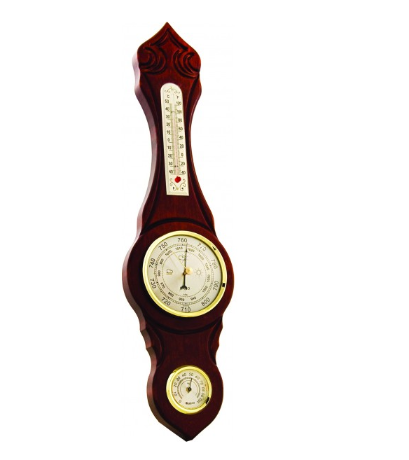- Атмосферный барометр анероидного типа - принцип его работы основан на колебании стенки полого цилиндра, внутри которого сильфон (разрежение среды). В отличие от ртутных аналогов, также полностью безопасен для эксплуатации. Отображает давление атмосферы в пределах 710 – 800 mmHg (мм. рт. ст.) или 940 – 1060 hPa (гПа).