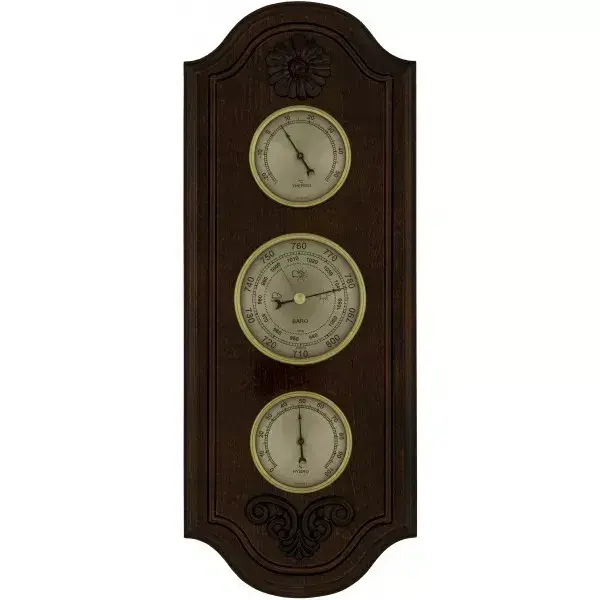 У метеостанции изящный деревянный корпус с резным цветочным орнаментом, с пропиткой от плесени и отделочным лакокрасочным покрытием цвета «орех». В корпусе — 3 встроенных прибора с закрытыми циферблатами цвета слоновой кости, с чёткой, хорошо читаемой даже в очках, разметкой и изящными чёрными стрелками.