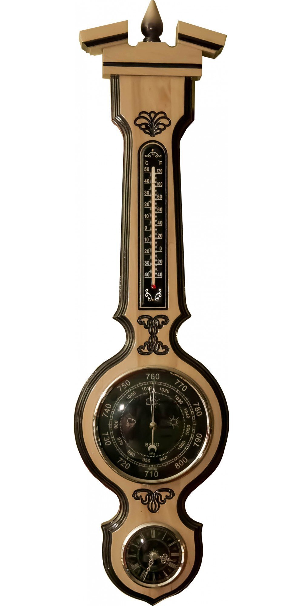 - Размеры шкал – барометра Ø70 мм, часов Ø130 мм, термометра – 130 мм