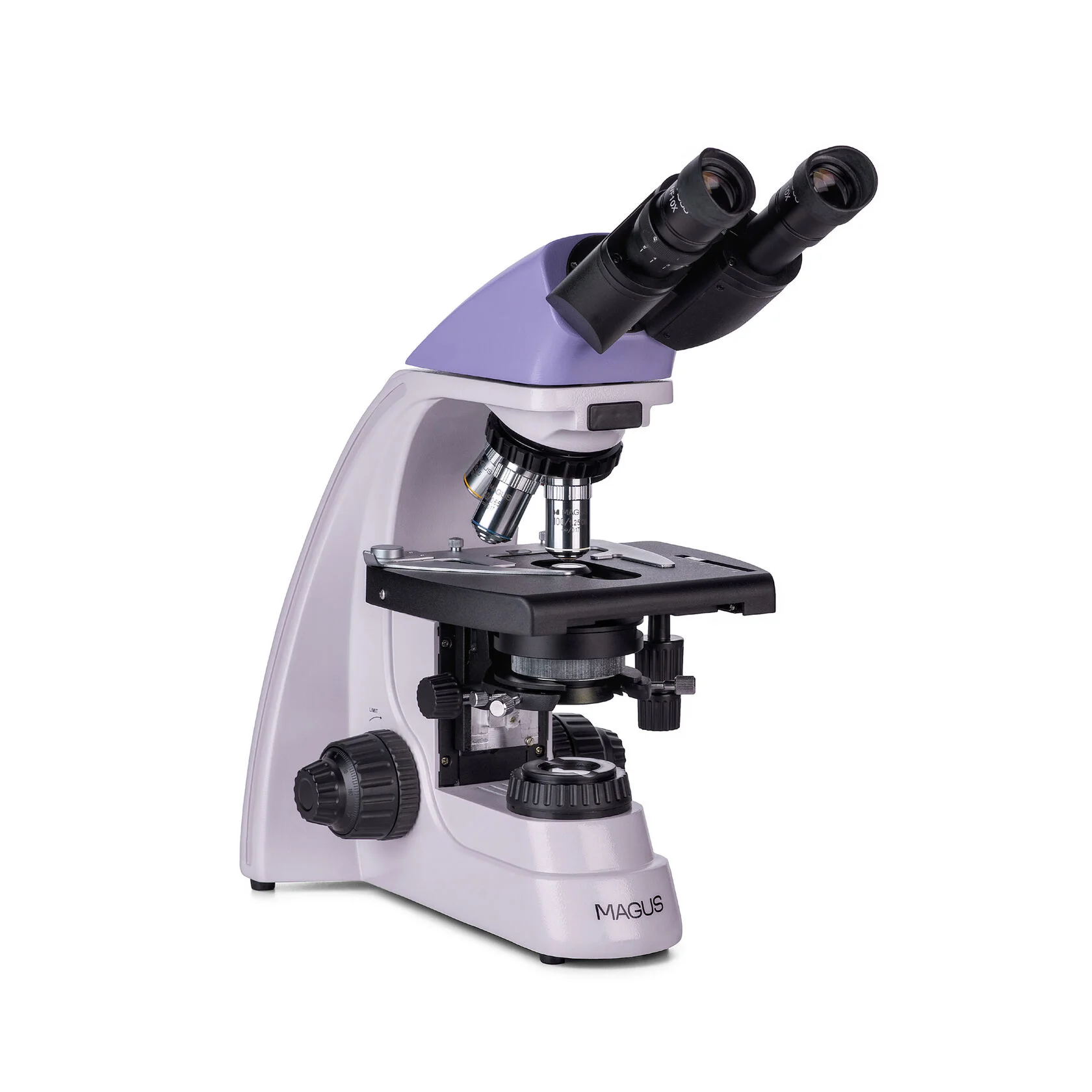 На левом тубусе бинокулярной насадки находится механизм диоптрийной подвижки. Вращение окулярных тубусов на 360° обеспечивает удобство работы для пользователей разного роста. В револьверном устройстве предусмотрено 5 гнезд для установки объективов: 4 ахроматических объектива включены в комплект и 1 объектив можно установить дополнительно. Револьвер повернут «от наблюдателя», т. е. над предметным столиком остается достаточно свободного пространства. В базовой комплектации увеличение микроскопа составляет от 40 до 1000 крат, дополнительные окуляры повышают предел увеличения до 1500, 1600 и даже 2000 крат.