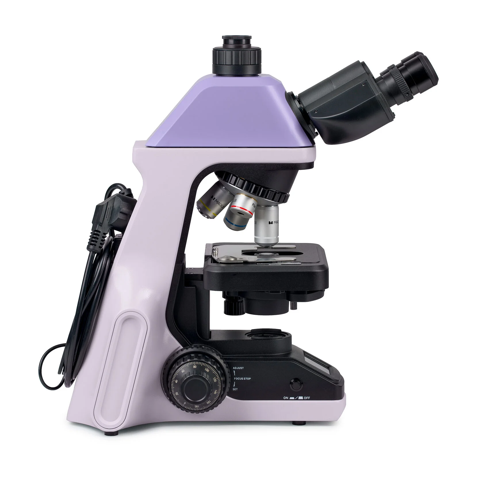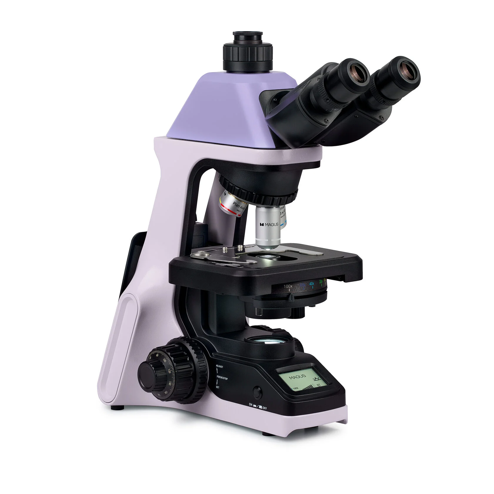 MAGUS Bio 240T – студенческий биологический микроскоп для работы в светлом поле и исследования в проходящем свете. Модель обладает рядом особенностей: имеет кодированный револьвер, который «запоминает» настройки освещения для каждого объектива; встроенный ЖК-монитор для отображения выбранных настроек и тринокулярную визуальную насадку с отдельным тубусом под цифровую камеру.