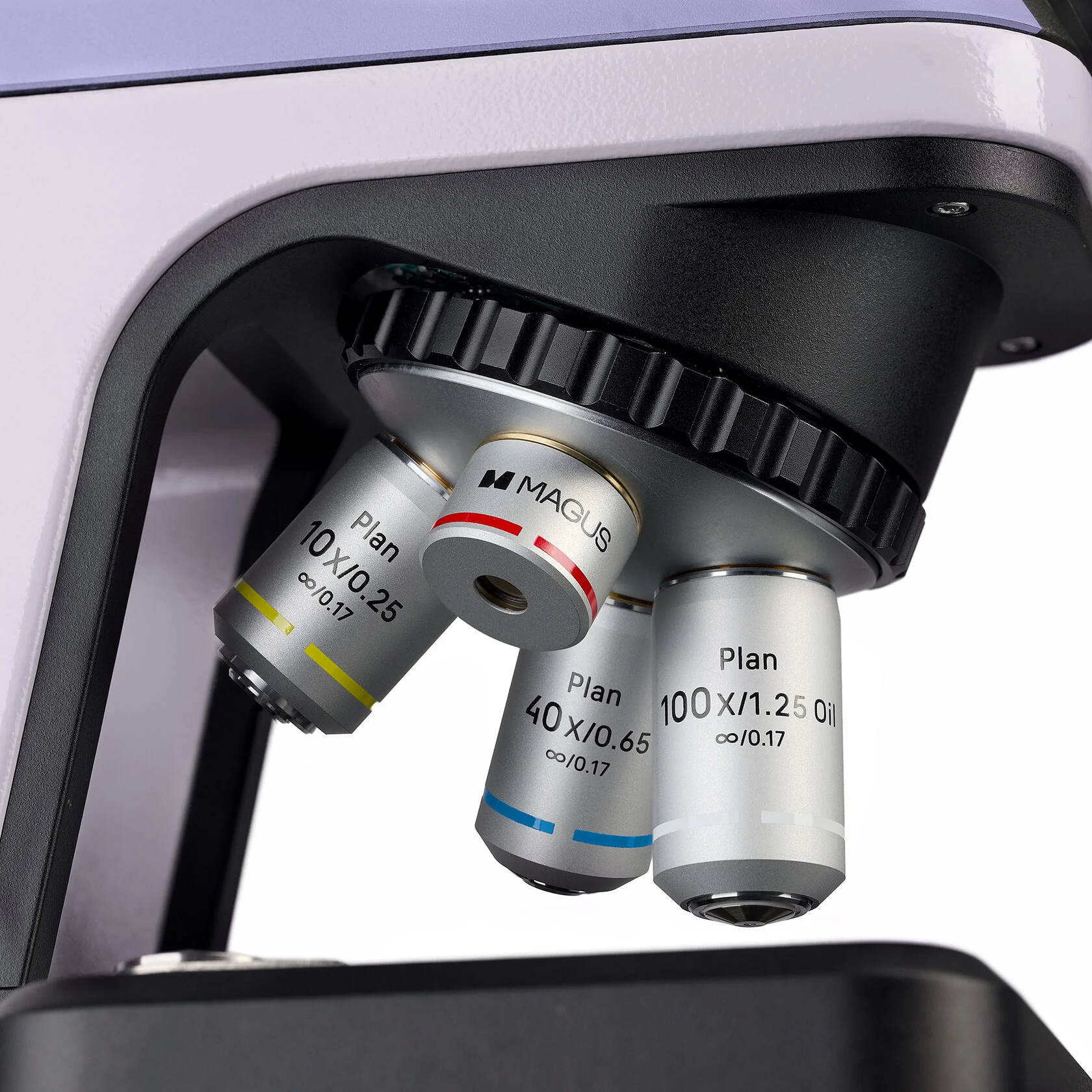 Револьвер имеет 4 гнезда под объективы и находится в положении «от пользователя» – перед исследователем расположен рабочий объектив, остальные направлены в противоположную сторону. Такое положение создает свободное пространство перед пользователем. Револьвер кодированный – яркость освещения настраивается для каждого объектива и затем при смене увеличения воссоздается. Это удобно, так как объективы пропускают разное количество света, и при повороте револьвера и смене объектива яркость освещения в окуляре изменяется. Из-за этого устают глаза, и пользователь каждый раз тратит время на подстройку освещения. «Умное» освещение поддерживает выбранную яркость и автоматически переключает ее при повороте револьвера.