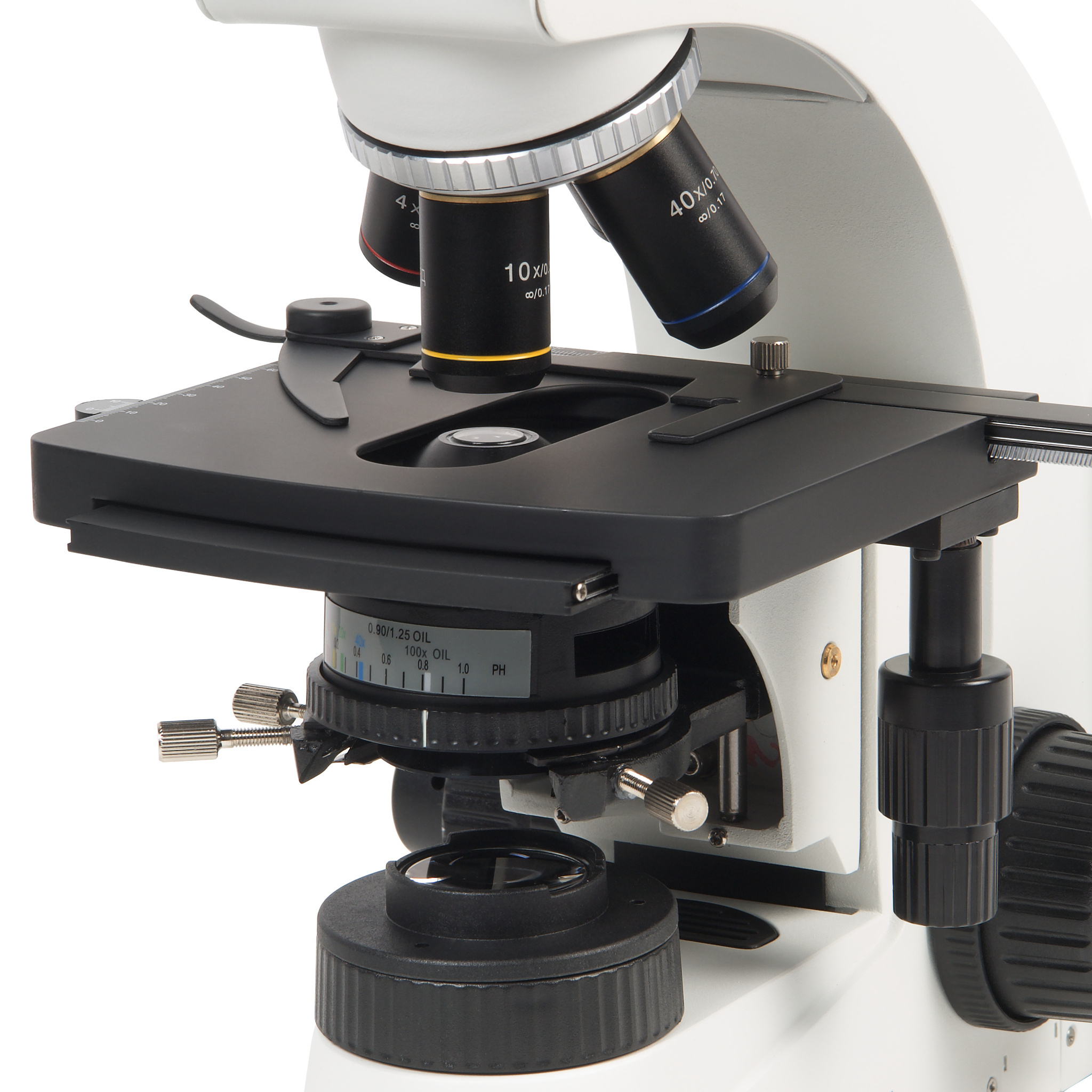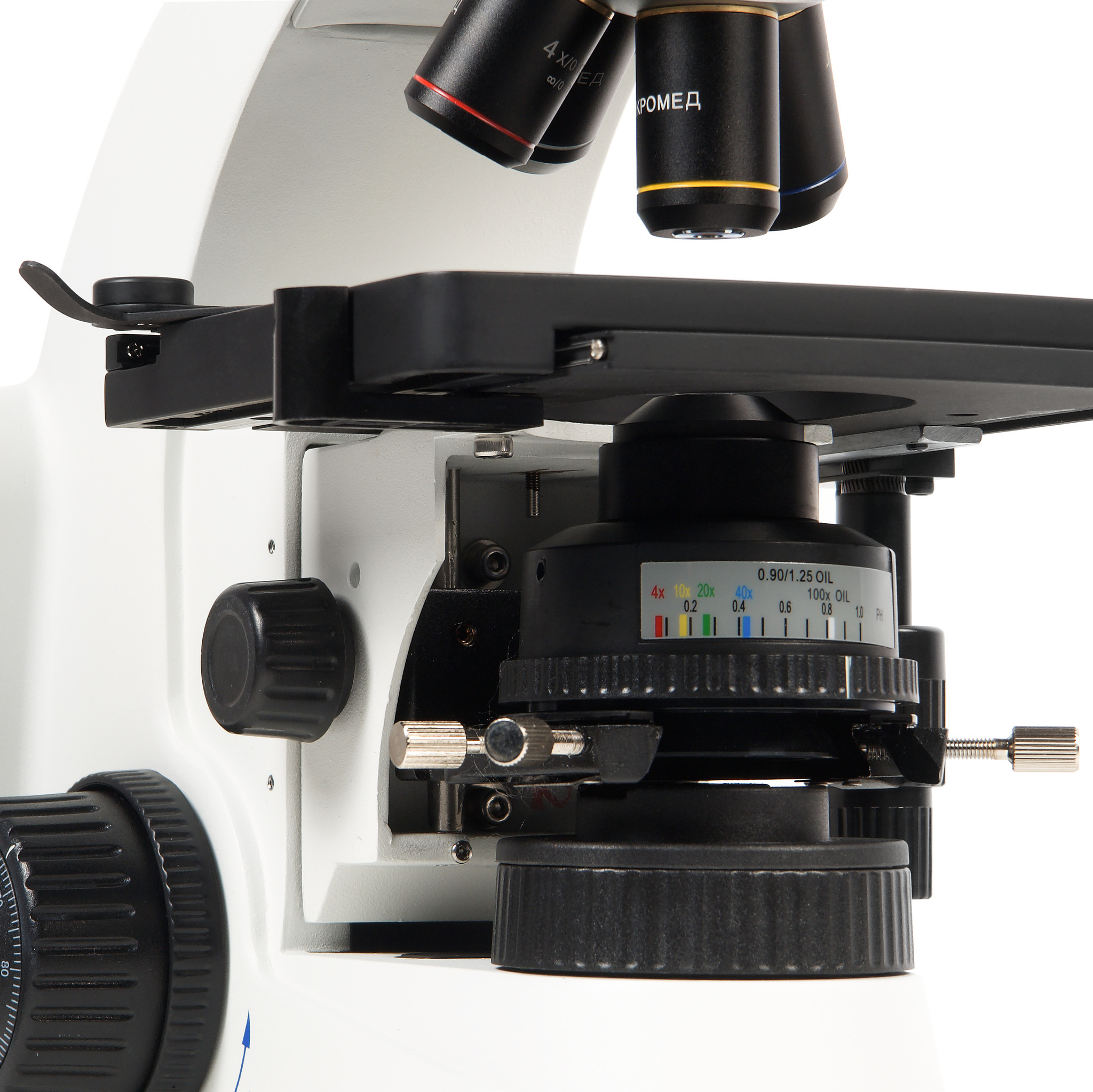 Высокое оптическое качество объективов обеспечивает информативность и комфорт при исследованиях и отличное качество записываемых изображений. Все объективы парфокальны, поэтому при смене увеличений не теряется наводка на резкость. Объективы микроскопа установлены на револьверном устройстве, рассчитанном на 4 объектива, что позволяет наблюдателю быстро переходить к исследованиям с различными увеличениями.