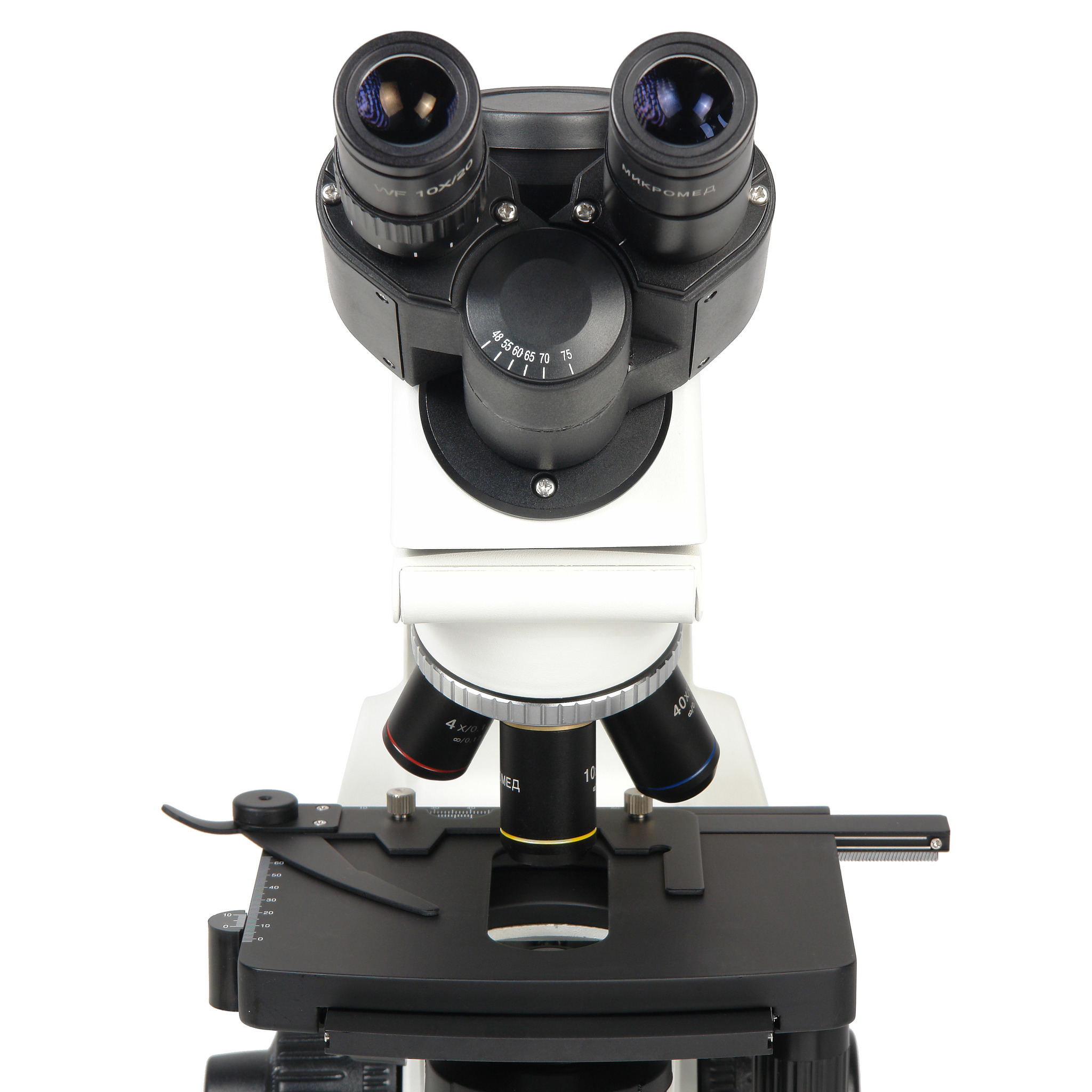 Микроскоп Микромед 2 (3-20 inf.) комплектуется тринокулярной визуальной насадкой. Насадка имеет независимый тубус для установки цифровой окулярной камеры – видеоокуляра для вывода изображения на внешнее устройство и записи файлов. Конструкция микроскопа позволяет одновременно проводить визуальное наблюдение через оптические окуляры, и использовать цифровой канал без переключения светового потока.
